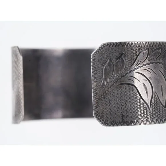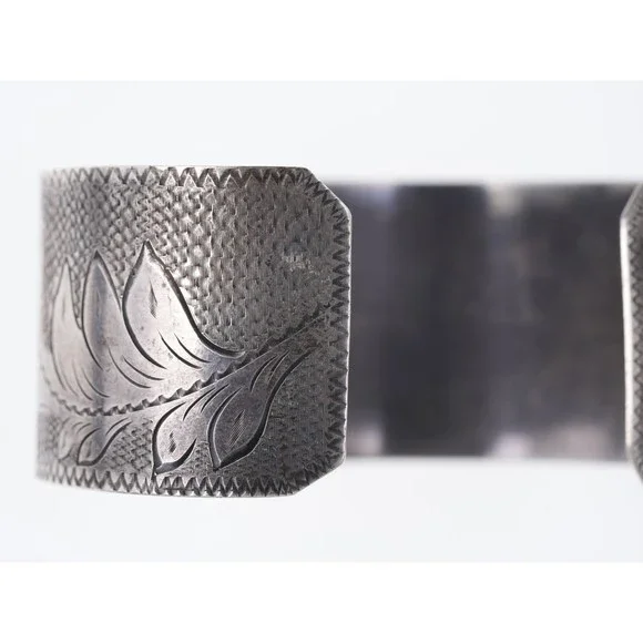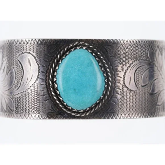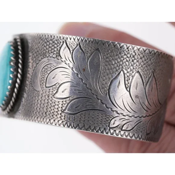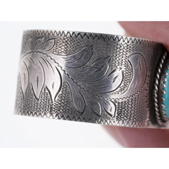 Hand Engraved Southwestern Sterling/Turquoise cuff bracelet. Unmarked tested silver (guaranteed 90% or more) Very unusual cuff with the most amazing done by hand, it appears Native American but I´m not 100% sure, nice old mid 20th century cuff. 7" including the 1" gap 1 1/8" wide 42.2 grams