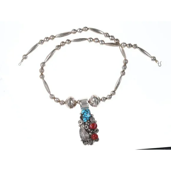 Navajo Sterling turquoise/coral pendant and beaded necklace