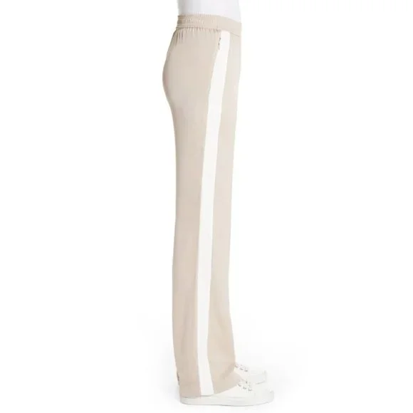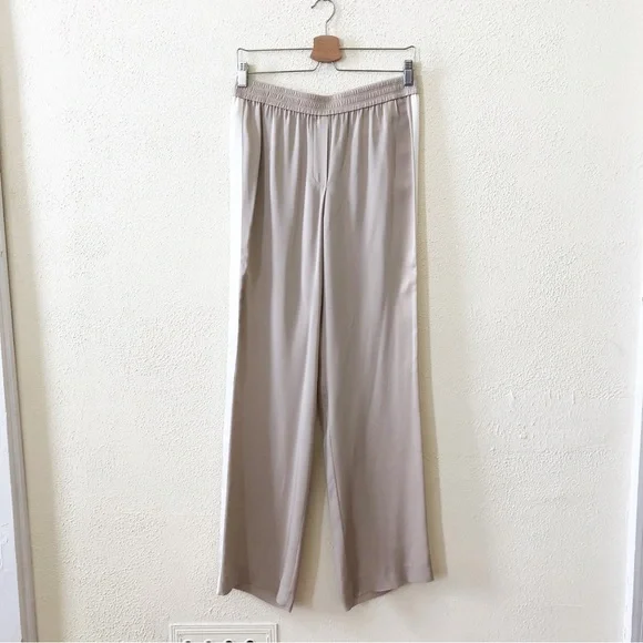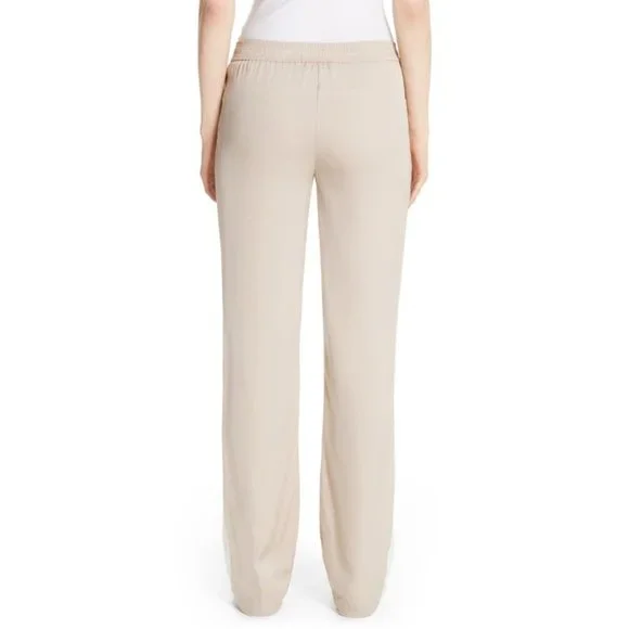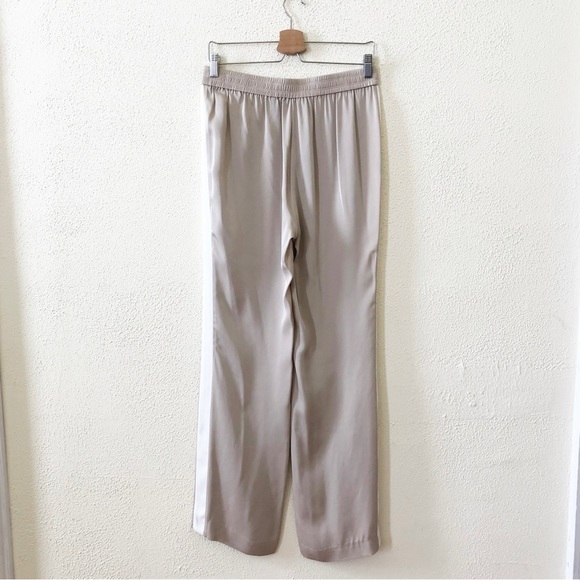 100% silk wide leg trousers with white side stripe detail. In excellent condition with no flaws.