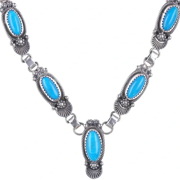 Roie Jaque Navajo, Acoma, and Apache Sterling and turquoise necklace. Approximately 19.5" long with 1 1/8" center drop, 25.2 grams with no issues.Roie was born of three Native...