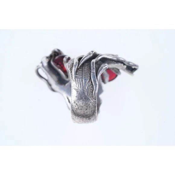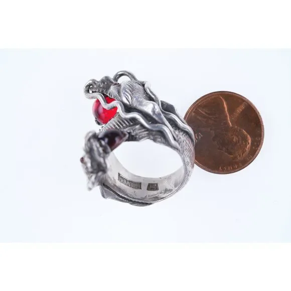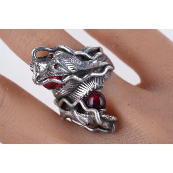sz6.75 Antique Chinese Silver Dragon ring. Very nice ring marked and tested silver from the first quarter of the 20th century, red stones untested appear to be rubies. 20.4 grams,...