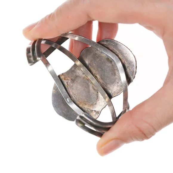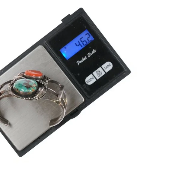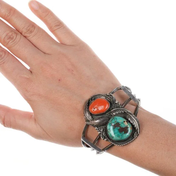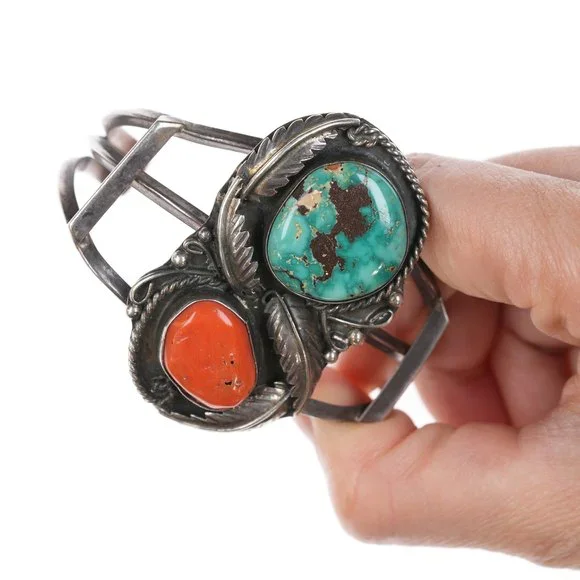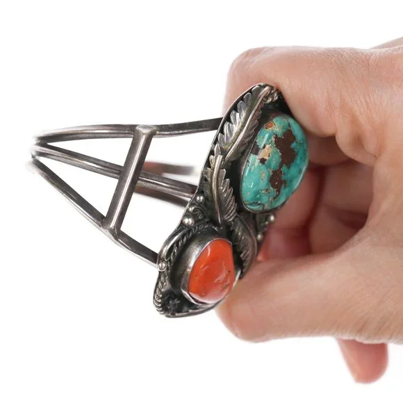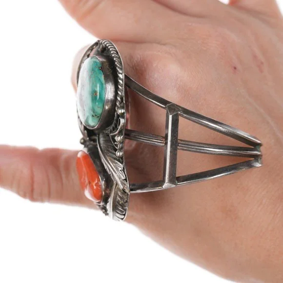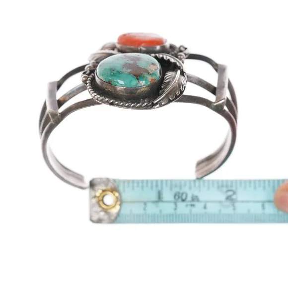 6 3/8" Vintage Native American Silver, turquoise and coral cuff bracelet