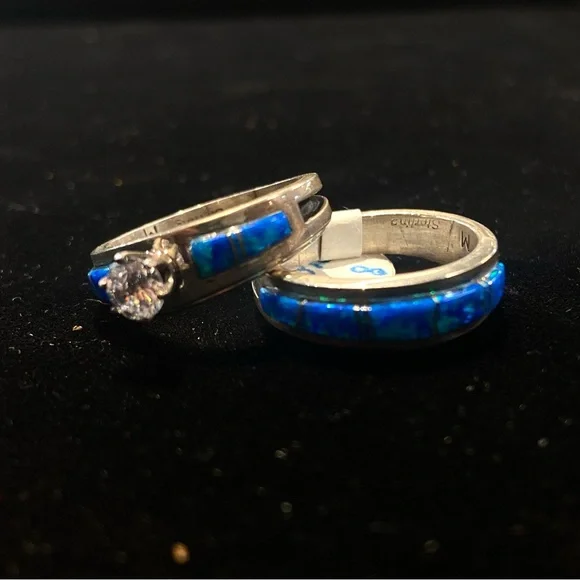 Navajo wedding set blue fire Opal and cz set in sterling silver size 8. Designed and created by master silversmith Melissa Yazzie.