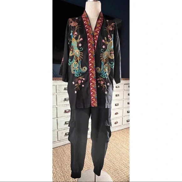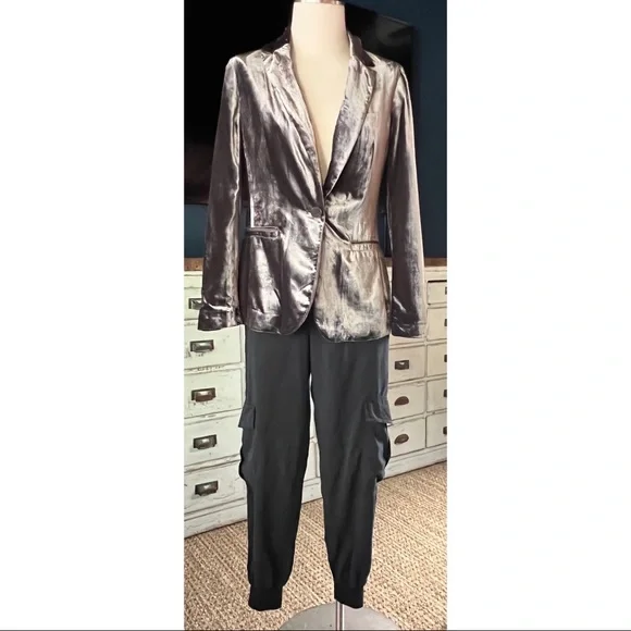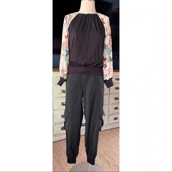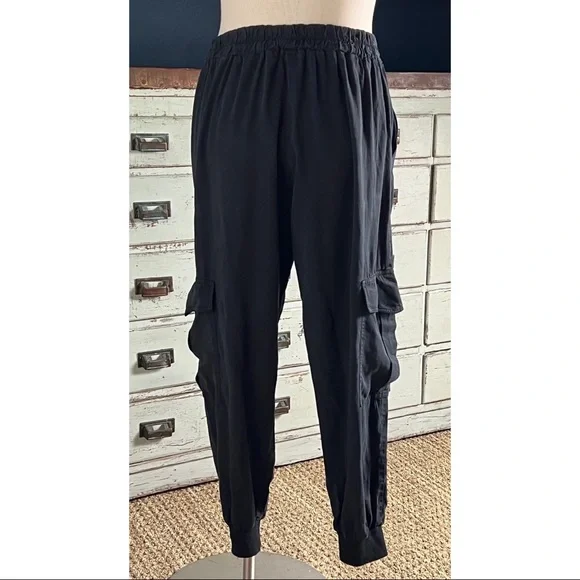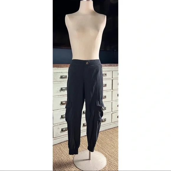 New With TagsSize SmallThese black 100% tencel pants by Amadi have a dressy cargo style.The pants have a loose leg and a tapered jogger ankle.They have a tortoiseshell button & zipper closure.In the pictures the pants are paired with Anthropologie Dawn Bug Blouse, Johnny Was Shula Peacock Kimono, Johnny Was Lais Striped Blouse, Anthropologie Gallery Velvet Blazer, & Anthropologie Tie Dye Pullover Sweater.Measurements laying flat:Length 37”Inseam 27”Waist elastic back 14”Hips 18.5”Rise 11.5”