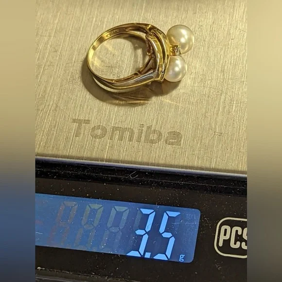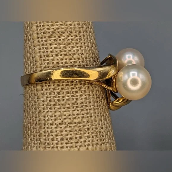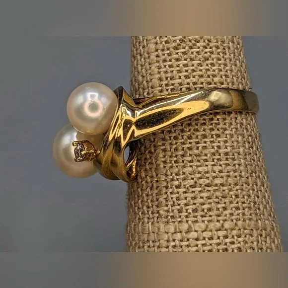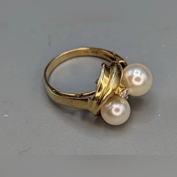 Product: RingMetal Type: 14K Solid Yellow GoldGemstones: Pearl and Diamond AccentCondition: Pre-owned (all preowned jewelry will be cleaned, again, prior to shipping)Ring Size: 5.25Dimensions:Larger pearl measures 7.0mm round, and smallerpearl measures 6.3mm round.Weight: 3.5 grams