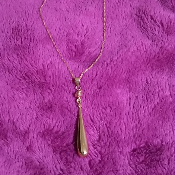 A14K Yellow Gold teardrop dangle pendant. It measures 2" from the bail. Made in Peru. Pendant with chain approx. 2 grams. Stamped "14K, Peru". 18" 14K Yellow Gold oval link chain...