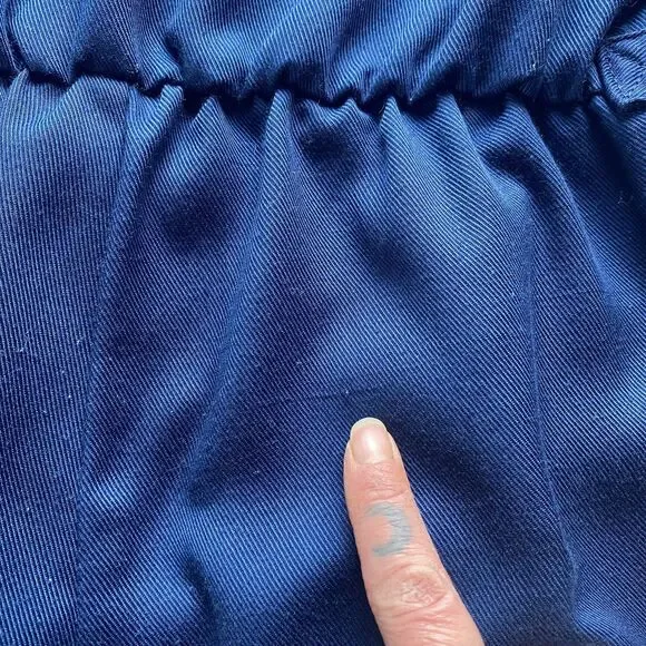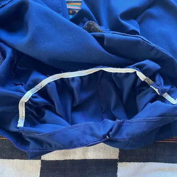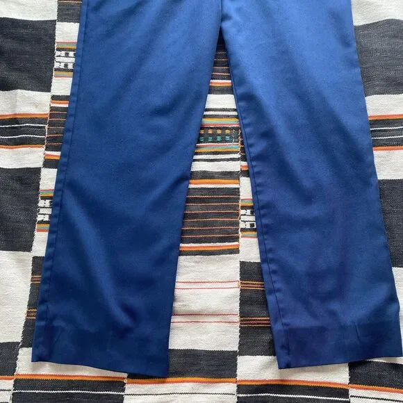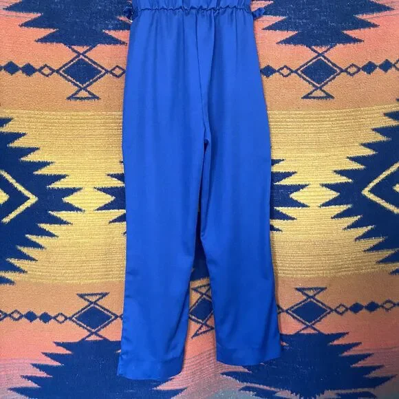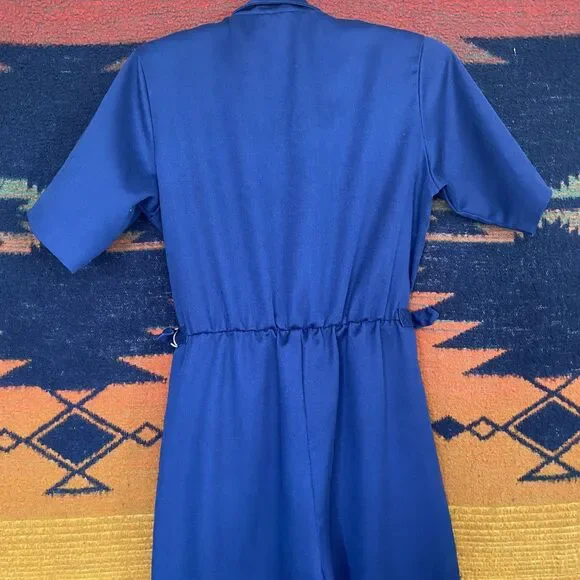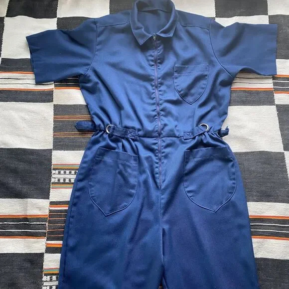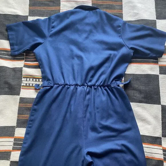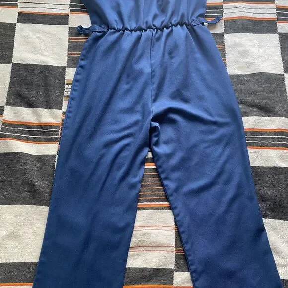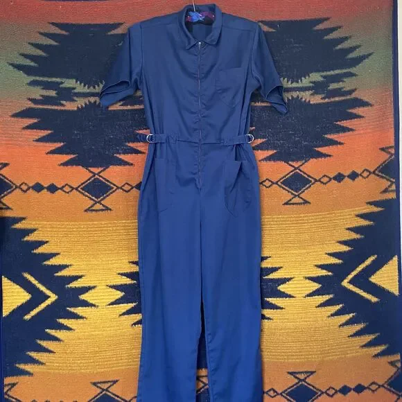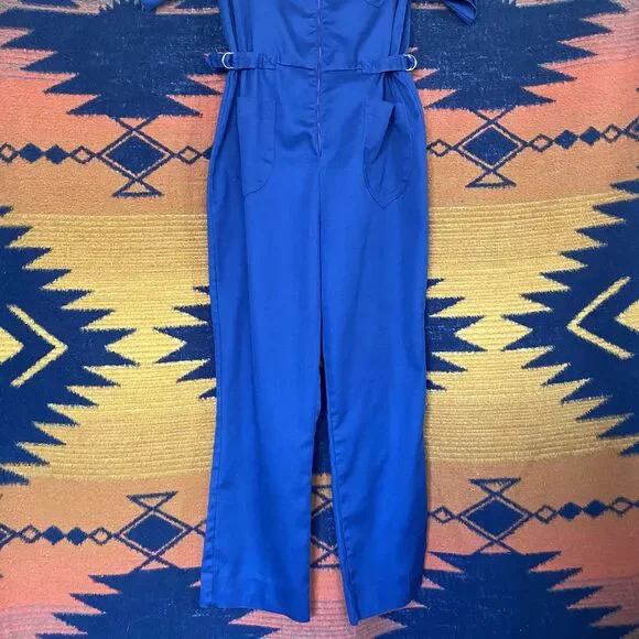Vintage Women´s Utility Jumpsuit from the 1970s in a casual boho style. The blue jumpsuit features a collar, Talon zip-up front, pockets, and a waist size of 15" flat (30). Made of a cotton blend in the United States, it has a chest size of 20.5" flat, inseam of 27.5", waist to hem length of 39", shoulder to shoulder width of 16", and shoulder to hem length of 55". Size is S/M.Jumpsuit is in great shape with No spots, stains, holes or fade. Has a small snag on back as seen in photos which is the only flaw. Very Light wear. Has Collar. 3 pockets. Elastic waist which is in great shape.Please check photos and measurements carefully for best description and let me know if you have any questions.Chest- 20.5Shoulder to waist- 16Waist to hem- 39Shoulder to shoulder/ 16Arm- 9.5Waist- 15 stretches to 18Inseam- 27.5Rise- 13Shoulder to Hem- 55Pant hem- 9Size- Small/Mediumall measurements taken flat
