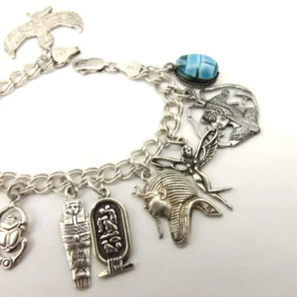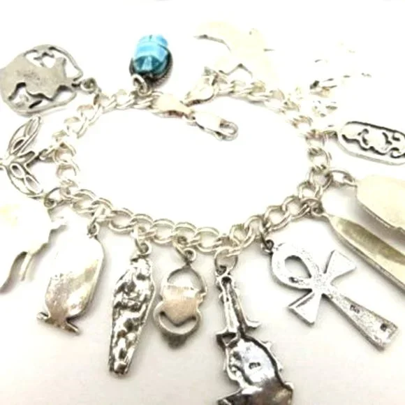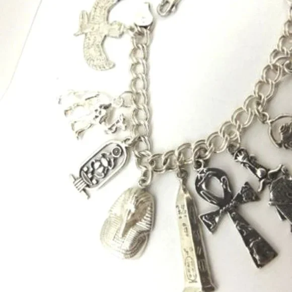 Extra heavy duty double link with room to add more if need be. Vintage bracelet from older Luxor stock. 37.8 grams - 7 inches long - bracelet stamped 92.5 Italy.14 charms as follow left to right:Isis - stamped w egyptian stamp on frontsolid camel - not stamped but testedscarab cartouche - not stamped but tested tut bust - stamped w egyptian stamp on frontobelisk - stamped w egyptian stamp frontankh - stamped w egyptian stamp backCleopatra - stamped STERscarab - stamped w egyptian stamp backmummy - stamped STERcartouche - stamped w egyptian stamp on frontKing Tut - stamped w egyptian stamp on frontIsis - stamped STERNefertiti - stamped w egyptian stamp on frontBlue faience scarab in sterling frame - not stamped but testedWill arrive fully insured with delivery tracking thru USPO*My egyptian charms and bracelets ect come from old stored Luxor hotels stock. I´ve been cleaning them to some degree and tweaking them here and there. Most bracelets generally have room to add more charms if desired.