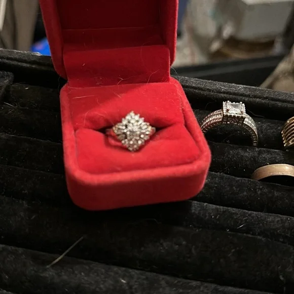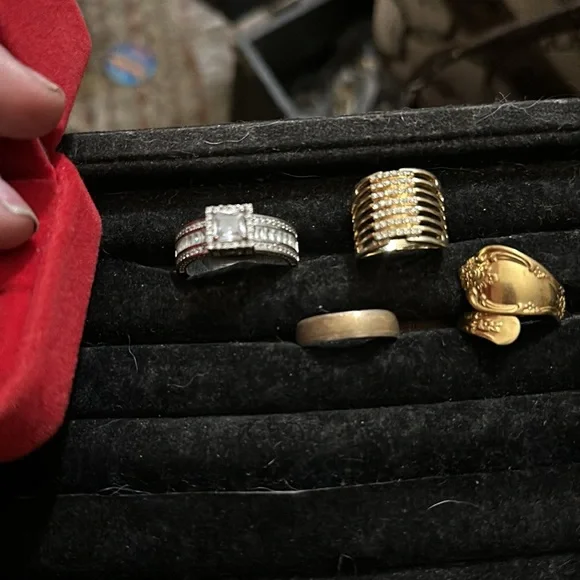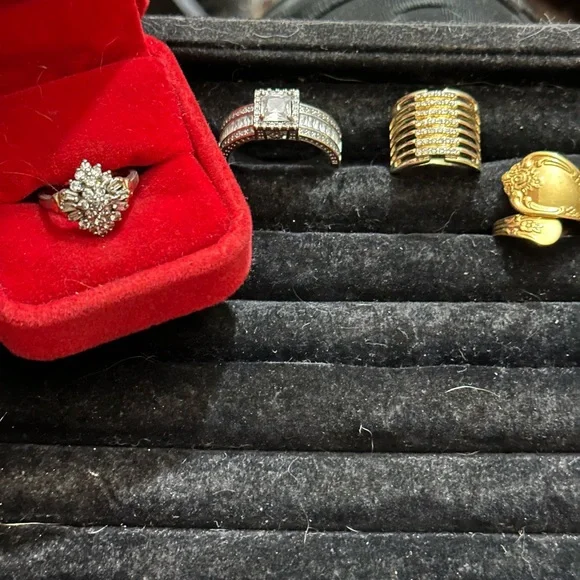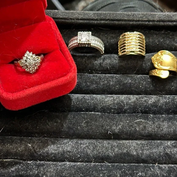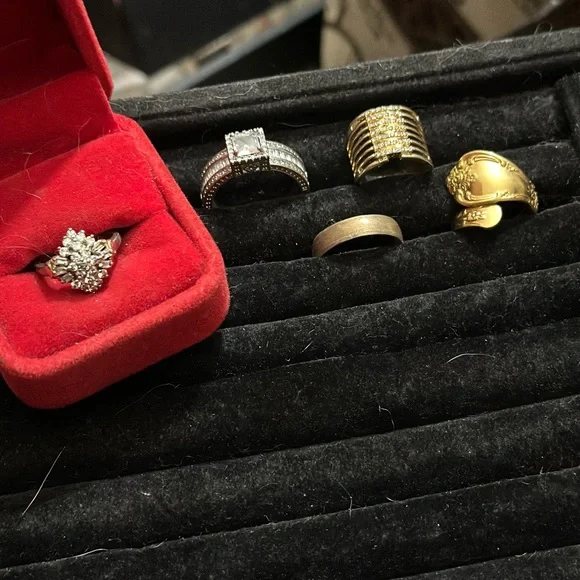 14k plum cluster diamond ring SZ 7 & 10k R.M.I vintage band ring SZ 9 & 3 other rings including spoon ring