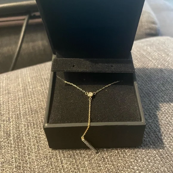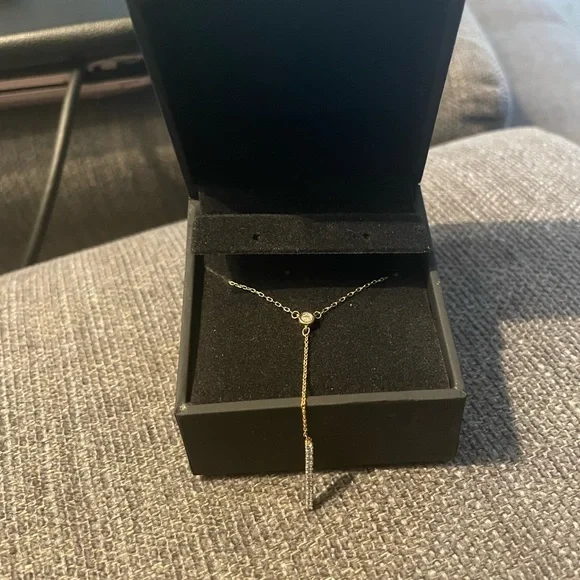 10K yellow gold,a line of round-cut diamonds on the drop chain for a total diamond weight of 1/8 carat. This adjustable 16 - 18-inch cable chain necklace secures with a spring ring clasp.Original purchase price $449.99. Original purchase receipt available upon request.