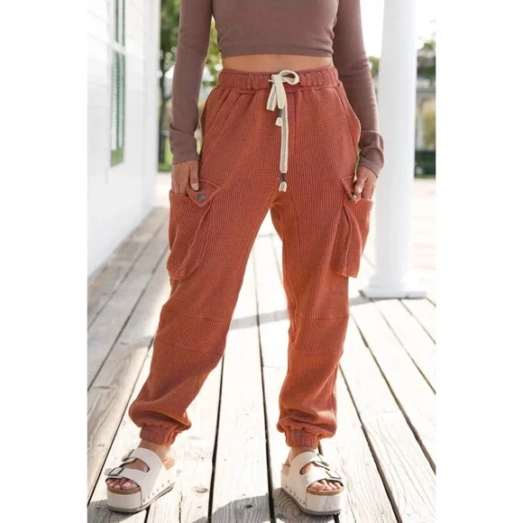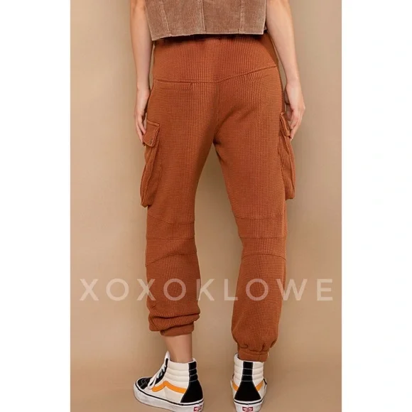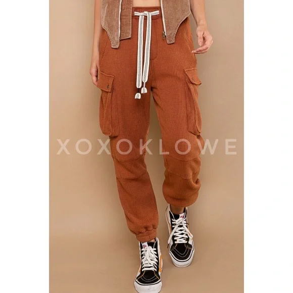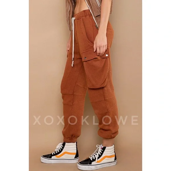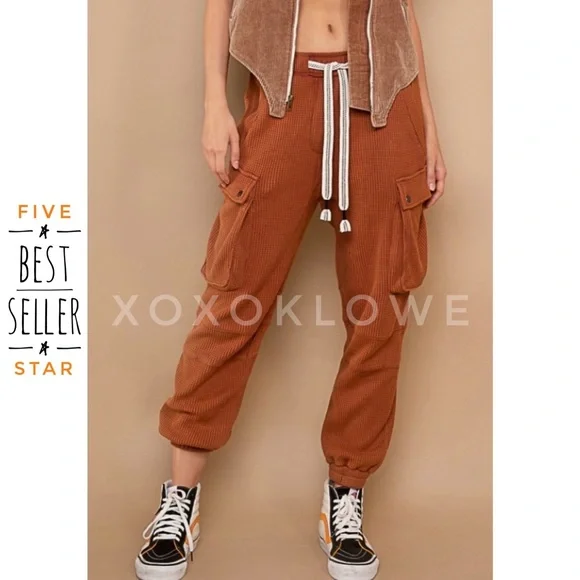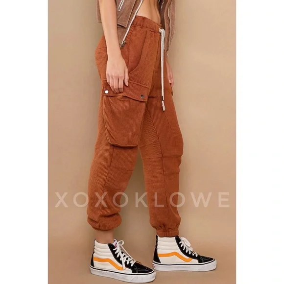 POL Waffle Knit Slouchy Cargo Joggers in BrickBRAND NEW - Also Available in Cream Ultra-comfy and so made for lounging, these slouchy pants are featured in a soft medium weight waffle-knit fabrication and full-length style with an adjustable drawstring waistband. Your new favorite airport outfit, these so cozy pants are perfect worn in or out of the house.FeaturesRegular FitColor is OatmealElastic Waist with Designer Drawstring2 Front Pockets2 Side Cargo Pockets2 Back Pockets Elastic Bands at Ankles100% CottonImportedApproximate Measurements - Read DisclaimerSmall Waist 24” to 36” Full Stretch Rise 13” Inseam 27”Med Waist 26” to 38” Full Stretch Rise 13” Inseam 28”Large Waist 28” to 40” Full Stretch Rise 13” Inseam 29”MEASUREMENT DISCLAIMER: Measurements are provided to assist you in making the best sizing choice. All measurements & sizing info given are approximate. They should be used as a guideline & not taken as the exact size of the garment. Sizing can differ between manufacturer batch runs therefore we can never guarantee the item you receive will be the exact measurements stated above. We measure manually so variations can occur. We also may not measure an item the same way you would measure it. Measurement/Sizing differences can & will occur. We do not take responsibility for this.POL Waffle Knit Slouchy Cargo Joggers in Brick