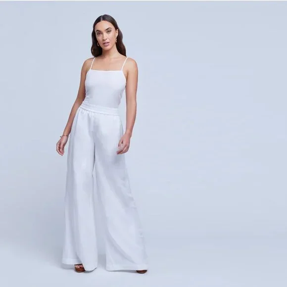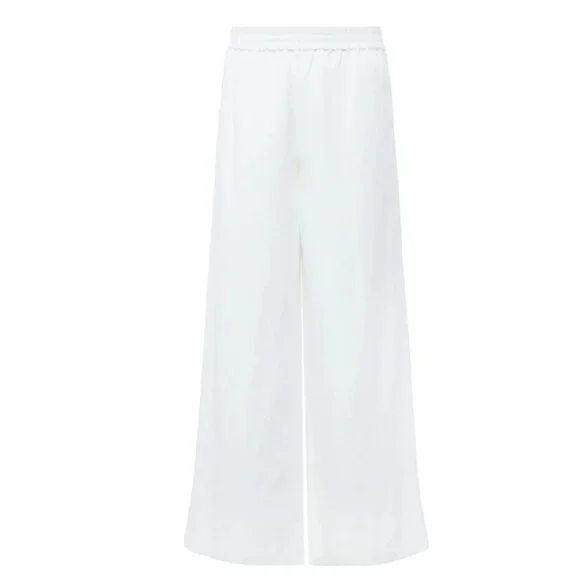 A sublime ultra-wide-leg pant in a pure-white linen-like fabric. Softly gathered stretch waistband fits securely at the high waist before cascading into full palazzo-style legs...