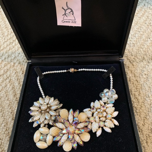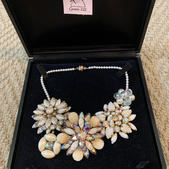 Simply exquisite handmade necklace from 3 vintage brooches and 2 vintage earrings. Strung on small pearl beads with beautiful gold and rhinestone clasp. No stones missing. See photo to see where the necklace falls high at the collarbone. Would show inside a collar or as the main attraction of a strapless top/dress. Truly one of a kind.