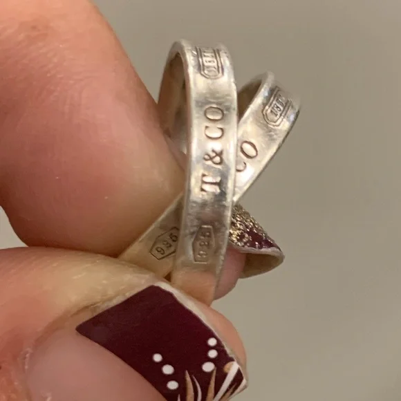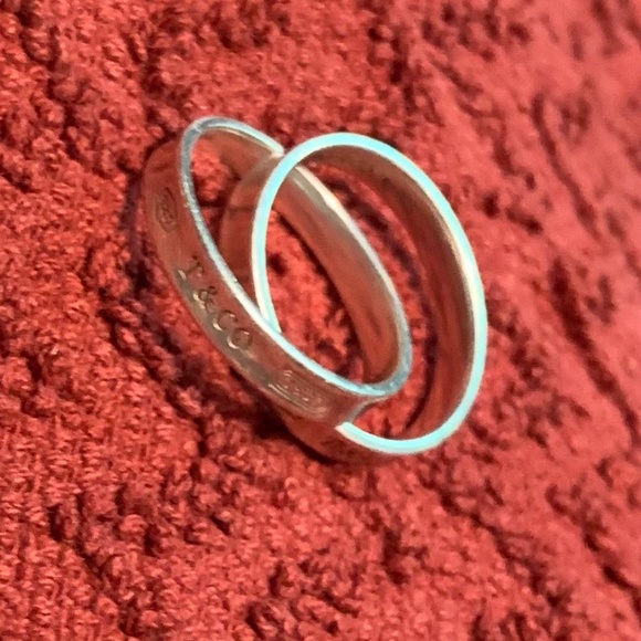 This spectacular ring is like new. Beautiful genuine Tiffany’s ring with the Tiffany’s bag and gift bag included with purchase. Its two rings intertwined with the T&CO stamped on the outer of both bands. This ring sells for $450 in the store or online.