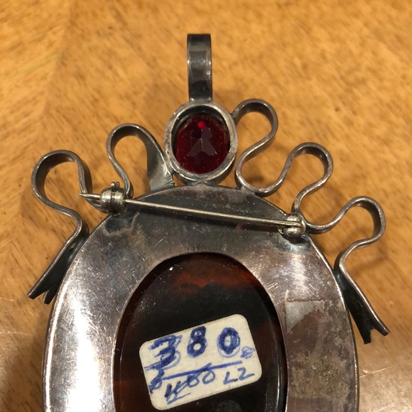 Lozana dark amber, silver, carved vintage pendant pin Rare , new Unique massive