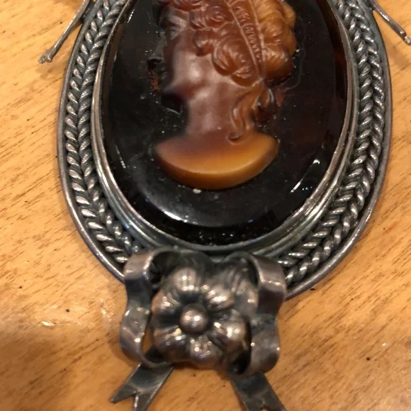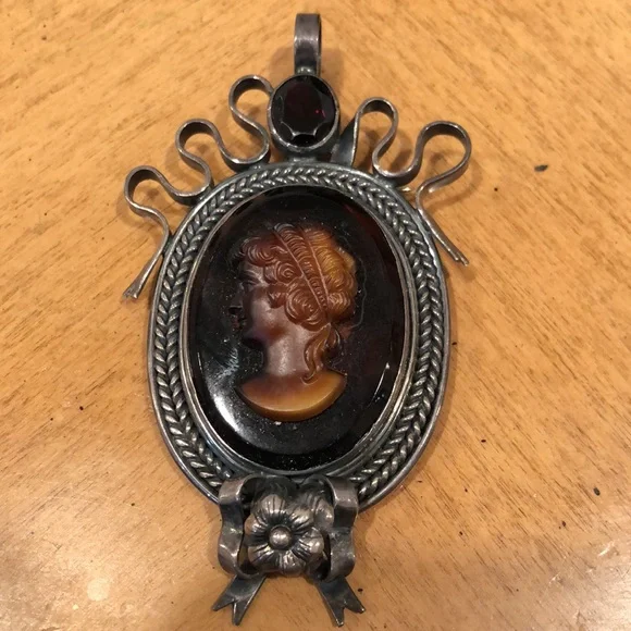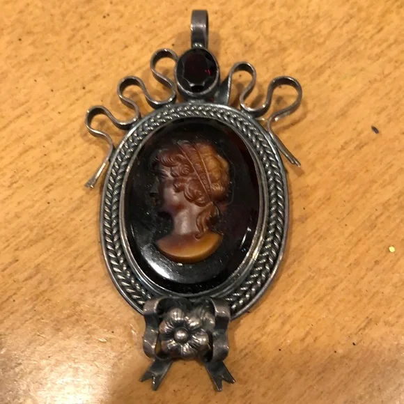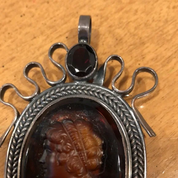Lozana dark carved cameo style face! Huge amber creating the platform of this fabulous, rare, unique , silver, heavy Pendant or pin! Gorgeous showstopperLooks like a piece found by in museums Read look ask questions! Estate piece! We do not polish or clean ganet gemstone on top Just a wonderful conversation piece ! Awesome❤️store tag, velvet pouchImpressive collectible Different