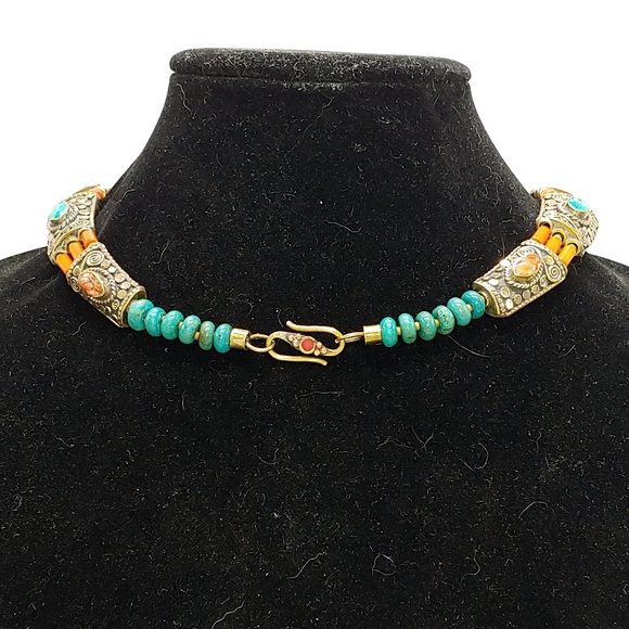 Amazing Hand made necklace with bronze, turquoise and coral beads as well as inlaid natural polished turquoise and coral. S hook enclosure. Stunning detail throughout. In...