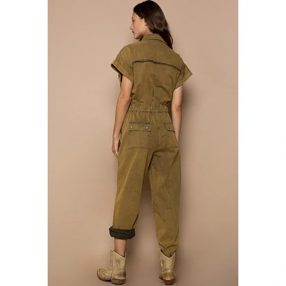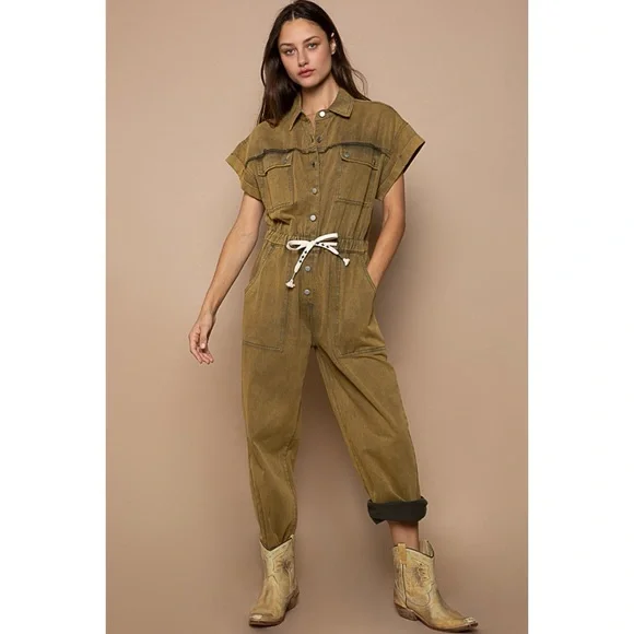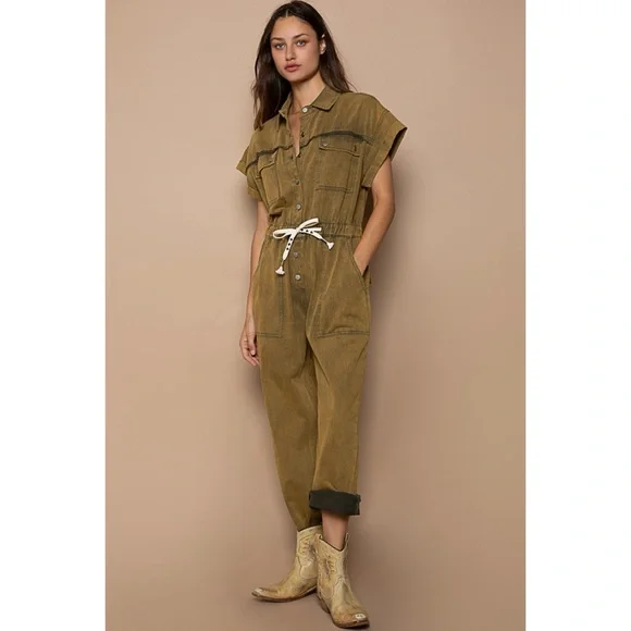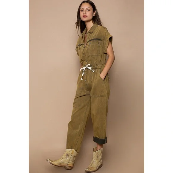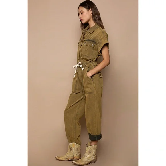 POL Olive Mineral Washed Button Front Adjustable Waist Denim JumpsuitBRAND NEWFeaturesRelaxed FitCollared Neckline Button Front Front ClosureDropped ShoulderRolled Short SleevesAdjustable Drawstring WaistMultiple PocketsMilitary & Uniform InspiredOlive Color is Mineral WashedFabric100% Cotton TwillImportedApproximate Measurements - Read DisclaimerOur models are wearing the size smallSmall: Bust 40” | Waist 31” Relaxed | Rise 12.5” | Inseam 28-1/4” | Length 58.5” | Sleeve Length 2-3/4”Med: Bust 42” | Waist 33” Relaxed | Rise 13” | Inseam 28-3/4” | Length 59” | Sleeve Length 3”Large: Bust 44” | Waist 35” Relaxed | Rise 13.5” | Inseam 29-1/4” | Length 59.5” | Sleeve Length 3-1/4”MEASUREMENT DISCLAIMER: Measurements are provided to assist you in making the best sizing choice. All measurements & sizing info given are approximate. They should be used as a guideline & not taken as the exact size of the garment. Sizing can differ between manufacturer batch runs therefore we can never guarantee the item you receive will be the exact measurements stated above. We measure manually so variations can occur. We also may not measure an item the same way you would measure it. Measurement/Sizing differences can & will occur. We do not take responsibility for this.POL Olive Mineral Washed Button Front Adjustable Waist Denim Jumpsuit