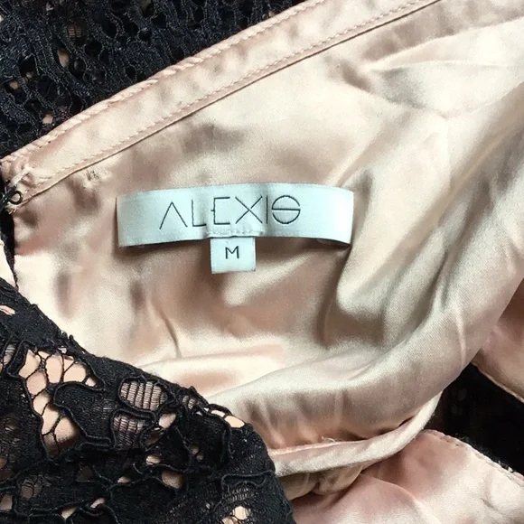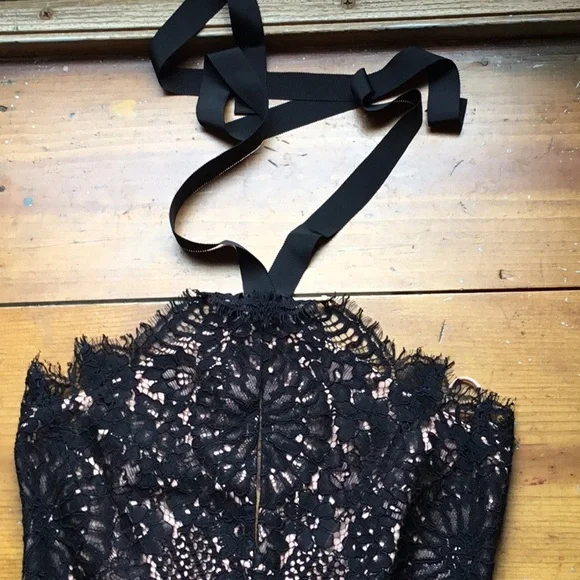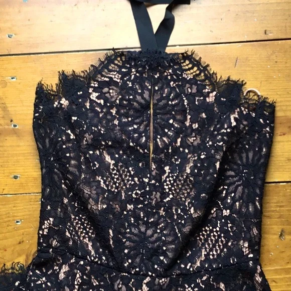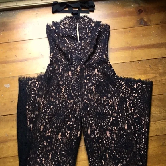 Beautiful Alexis black lace halter jumpsuit. The pictures don’t do it justice. The jumpsuit is beautiful!! All lined with a ribbon halter tie and back zipper closer. In excellent condition.