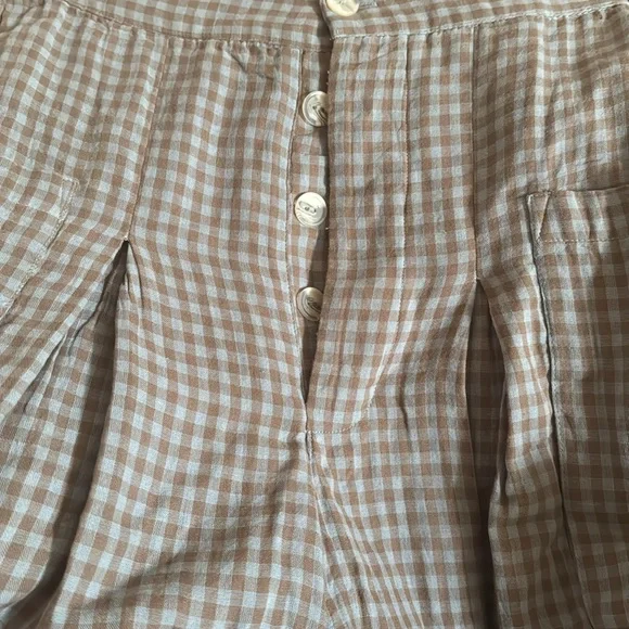 NWOT plaid pants with a button fly closure… they are a blue and tan/brown color… please refer to last picture… she has side pockets and has a stretchy waistband… these are a wide leg and they are lightweight and soft