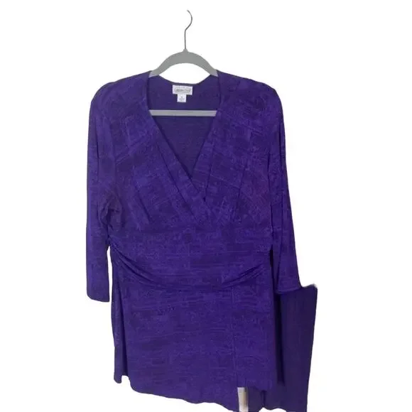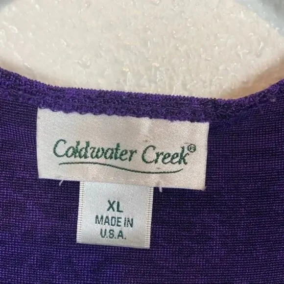 This Coldwater Creek XL Made in USA Purple Stretch Set is vintage and so cute!Great easy pack super stretchy slinky fabric. The dark purple in the top matches the pants.Very good vintage condition.Faux wrap top with asymmetric hem. Super flattering on.Approximate measurements Top:Pit to pit 21Waist 18Hips 22Shoulder 17Length 35 in front, 29 in backSleeve 20 from shoulderPants:Waist 18-24Hip 25Length 42Inseam 29.5Rise 14.5