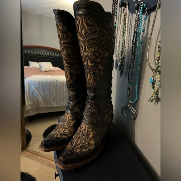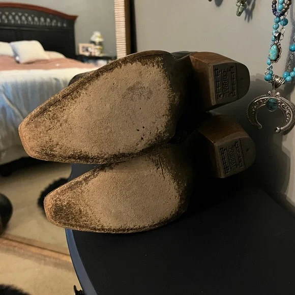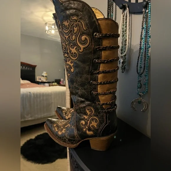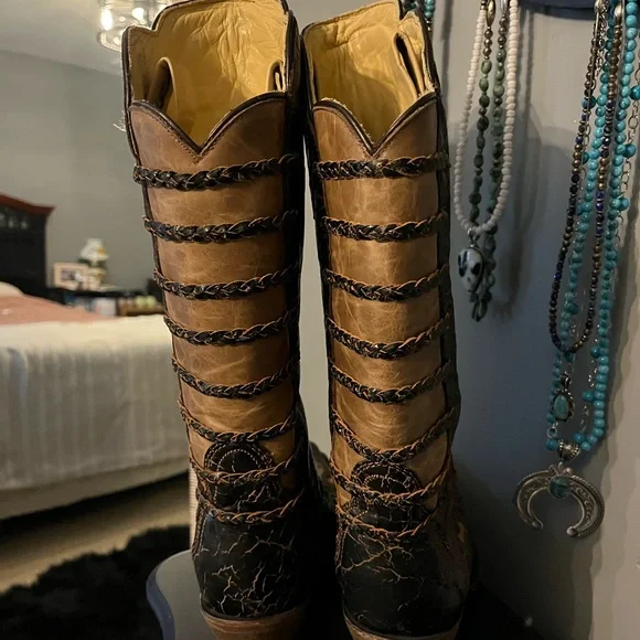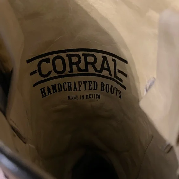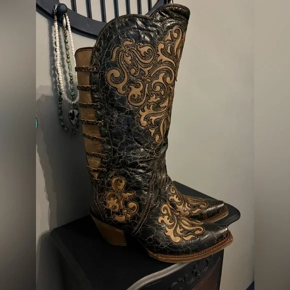 CORRAL WOMEN´S A3107 BLACK BONE INLAY BACK STRAPS COWBOY BOOT!Handcrafted by more than 90 artisans who guarantee its prolonged useful life.These stunning Women´s Corral Boots are a must-have for any fashion-forward woman. The black leather upper is beautifully handcrafted with intricate brown inlay and braiding details. The pointed toe and low block heel provide both style and comfort, making them perfect for any occasion from parties to formal events. The boots are made with high-quality leather and feature a medium calf width. They are perfect for winter, fall, and spring seasons. The floral pattern and embroidered accents add a touch of Western style to these Corral boots. Elegant handcrafted boots by Corral. Features a classic black and tan design. Ideal for a western style. Hand-lasted, Hand-cut,Hand-finished.I absolutely feel in love with these when I found them on-line however, I have way too thick calves so they won’t fit me right and arthritis in my feet.Pictures definitely do not do these boots any justice. **Note first two photos are stock photos.**