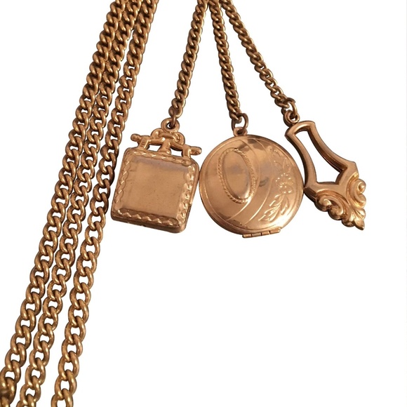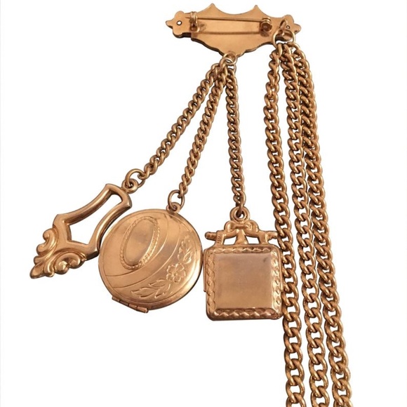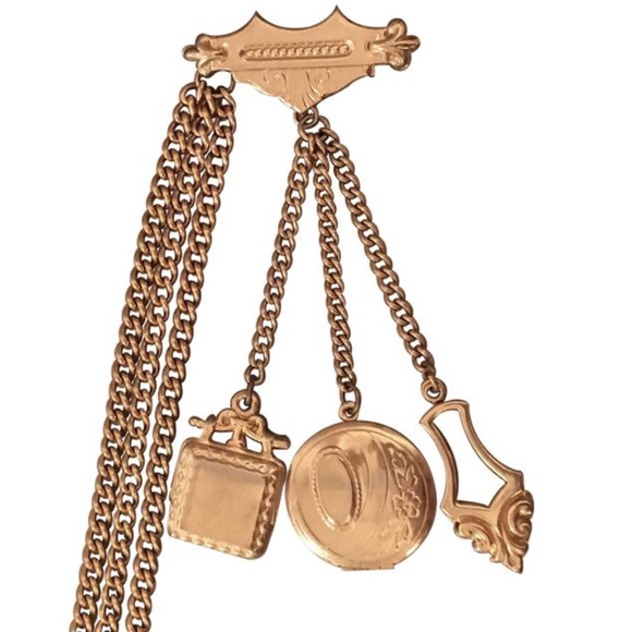 Beautiful vintage gold tone photo locket brooch. This piece features a double photo locket, along with two other uniquely designed pendants. Designed with hanging asymmetric gold chains.Measurements: Brooch Length 4.5cm, Photo Locket 2.5cm,Lengths 10cm- 31cm