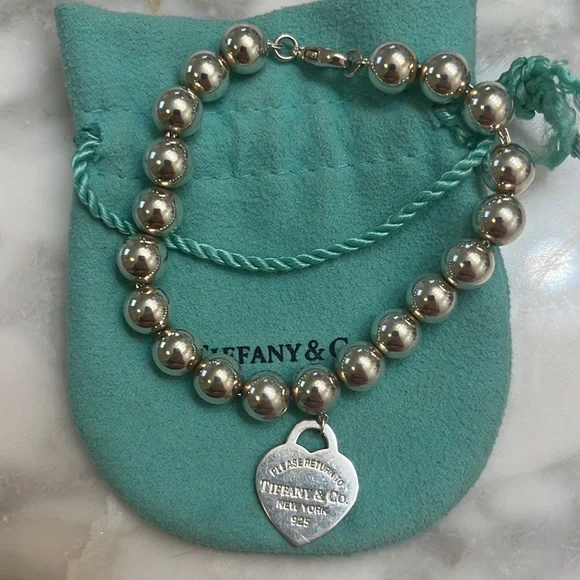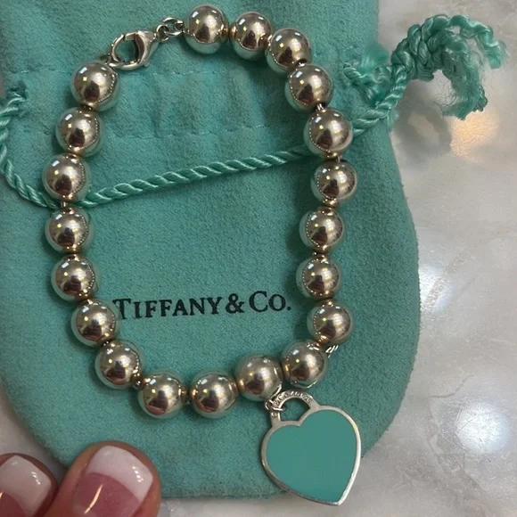 Tiffany & Co Enamel Heart Tag Beaded Bracelet. Barely worn, very minor wear. Authentic 925 with Tiffany & Co engravings on both sides of the tag. One side of the heart tag is enameled Tiffany blue, the other side is engraved silver “Please Return To Tiffany & Co New York 925”. Includes Tiffany & Co pouch.