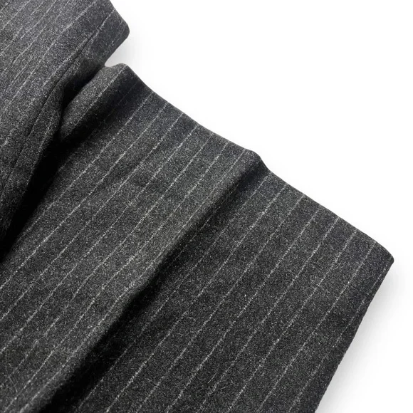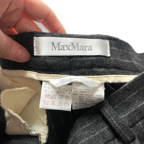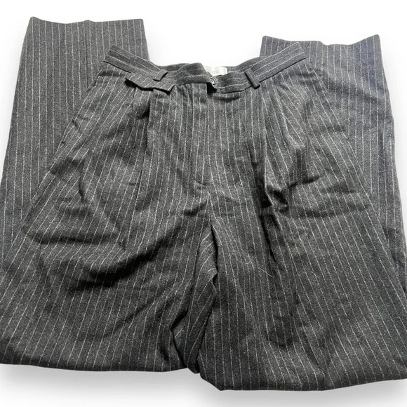 MaxMara Pinstripe Wool Trousers Black Dress Pants Size 12 PleatedThese elegant MaxMara pinstripe wool trousers are a versatile addition to any wardrobe. The black dress pants feature a flattering pleated front and straight leg style. With a zip closure and size 12 fit, they are perfect for any occasion, whether casual, formal, or business. Made from high-quality wool, these trousers are both stylish and comfortable. The classic striped pattern and exterior black color make them a timeless piece that can be worn in any season, from winter to summer. Add these dress pants to your collection today and elevate your everyday look.All measurements are taken with item laid flat and are approximate:Waist: 14”Rise: 14”Inseam: 32”Pilling is notedOpen to offers!
