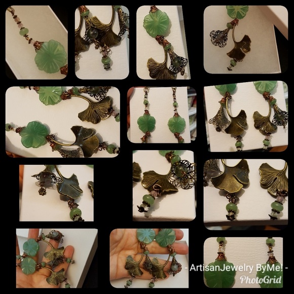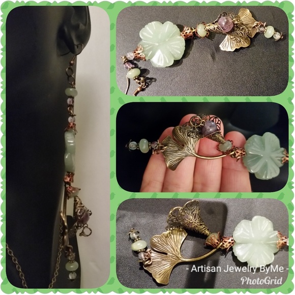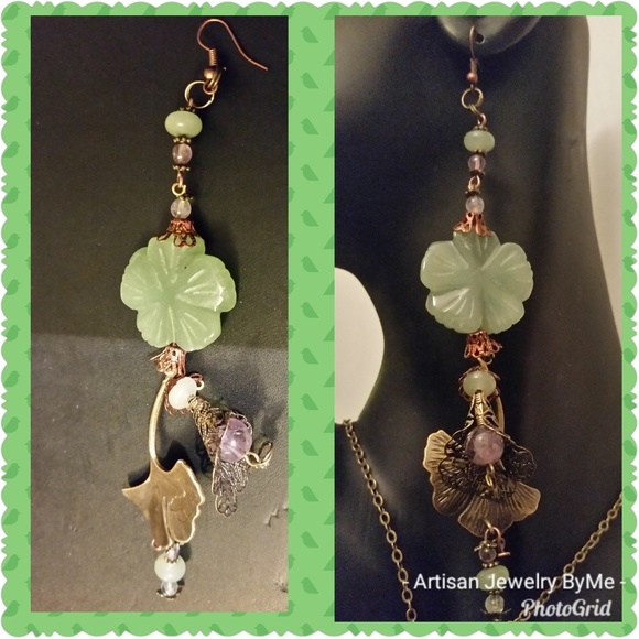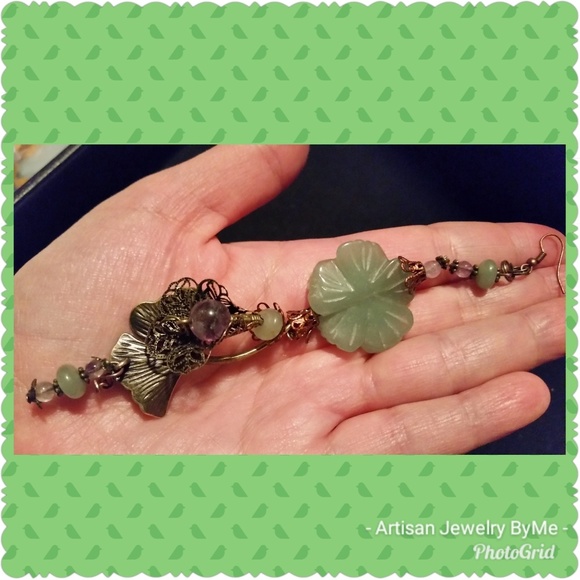 I Created Handmade Original Design Amazing Long Earrings 5.75 " of Layered dangles of Hand Carved Jade Aventurine Flowers & Tourmoline Flourite Beads. Large Bronzed Charms of GhinkoBiloba Leaf & Bronze Open Cutwork Filligree Trumpet Flower Encasing Carved Rainbow Purple & Green Tourmoline Flourite Gold Plated Flowers & Leaves Dangling Details Gold Plating Bronze Solid Brass & Copper Base.Choose Clip or Pierce see pics.Bronze Copper Gold Pl. BRASS.