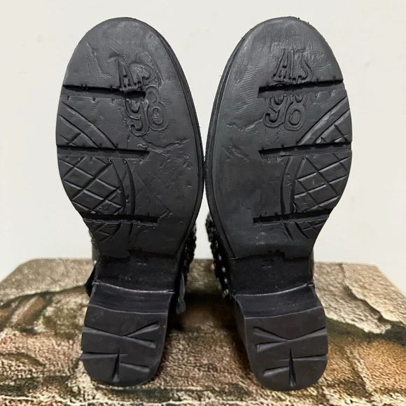 AS98 Black Studded Cross Boots Size 39PreownedPlease review all photos as they are part of the descriptionDo not have the original box but will pack with careThese do have scuffs - see photosNot able to bundle boots due to weight