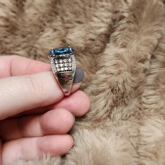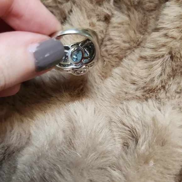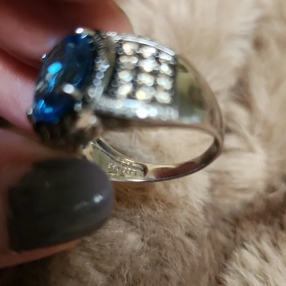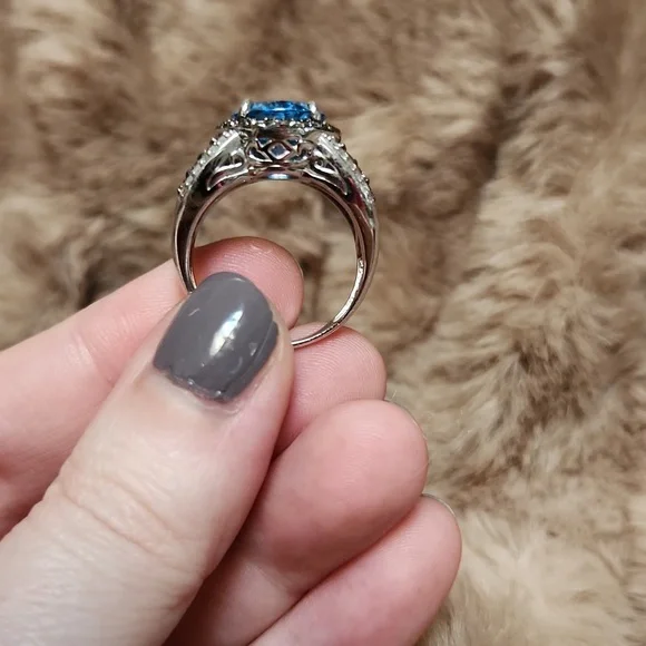 5.1ct oval Swiss blue topaz with 1.03ctw champagne and white diamonds. This blue is striking to me, and the champagne diamonds on either side seems to set off the blue. Lovely ring.Rhodium over sterling silver,size 7