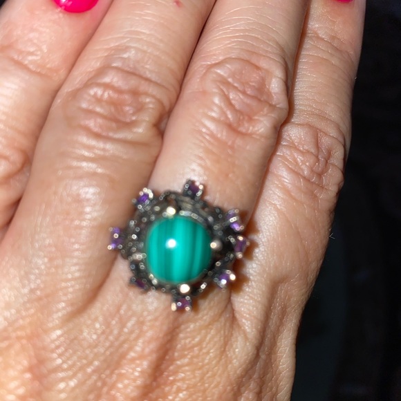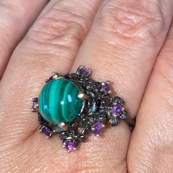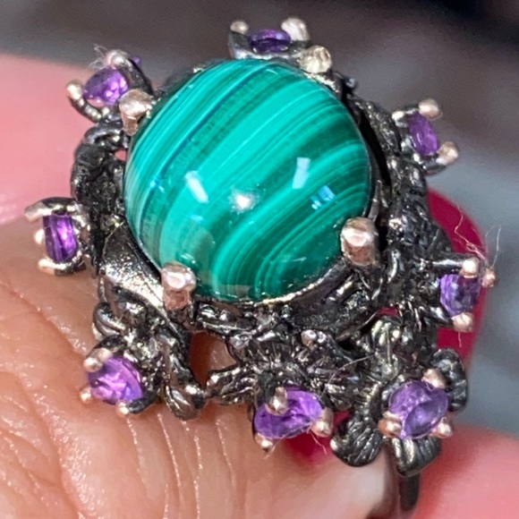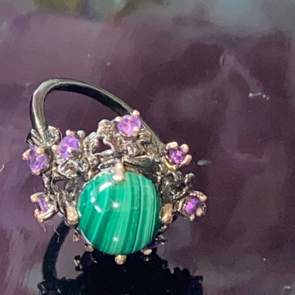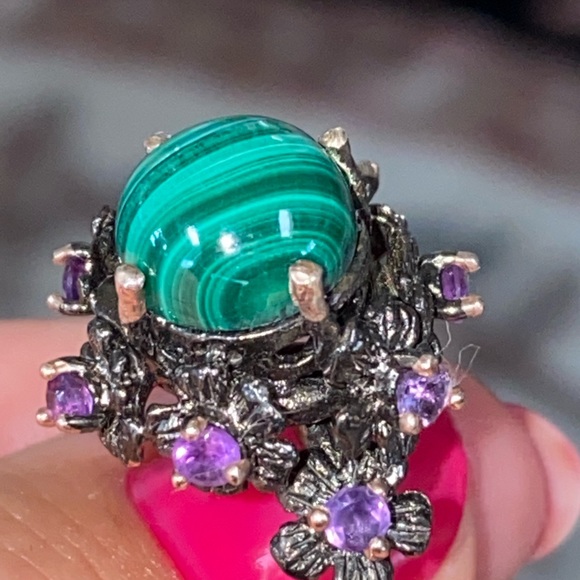 One of a kind feminine ring with genuine Malachite, accented with genuine faceted Amethyst, 925 sterling silver, black rhodium overlay and 14 K rose gold accents!Unique, high...