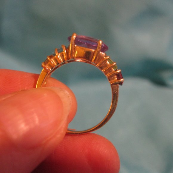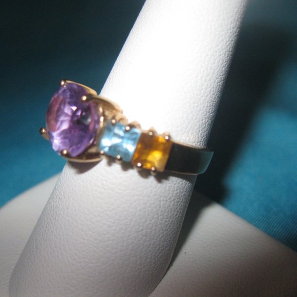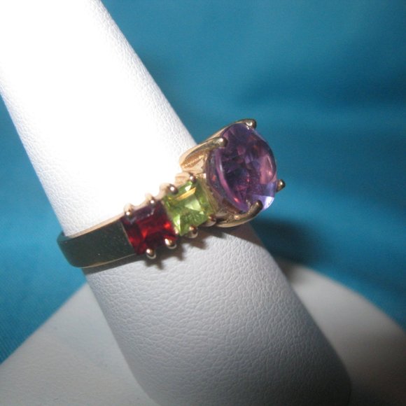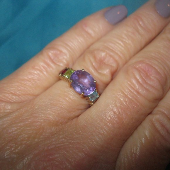 A rainbow of colors in a genuine gemstone ring. A center Amethyst is surrounded on one side by a Blue Topaz and Citrine, and on the other by a Peridot and Garnet. Stamped 10K, approx. 2.5 ctw. Hardly worn, great condition.