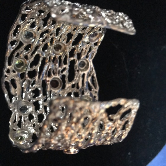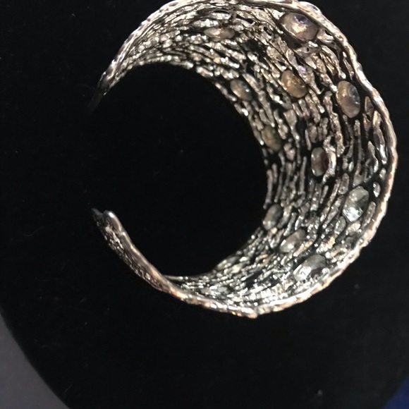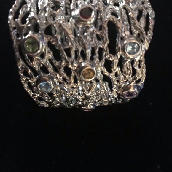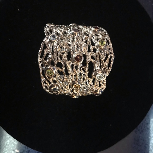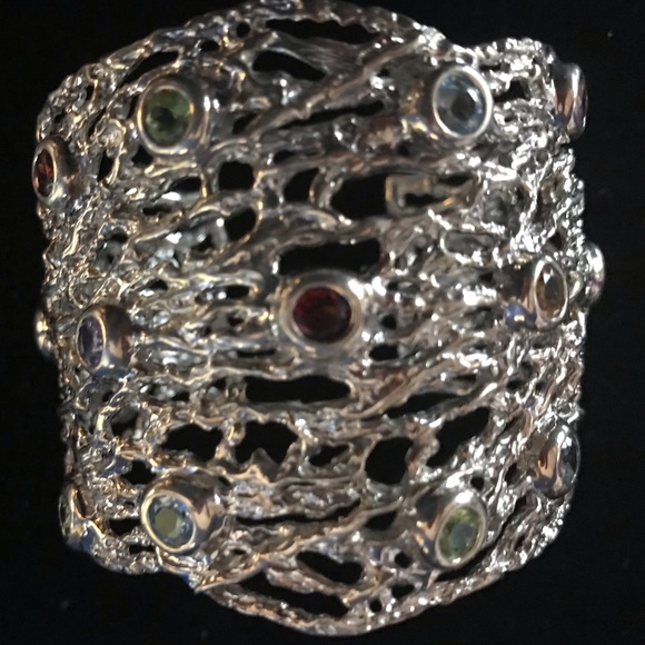 Very maliable looks small because I have a 5” wrist never worn only tried on ! This is true of most of my jewelry Magnificent statement has amythest peridot garnet blue topaz and I think citrine this is a steal ! Silver bends to fit but don’t want to keep openingNOT For Sale now