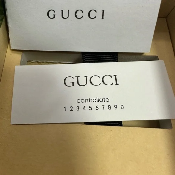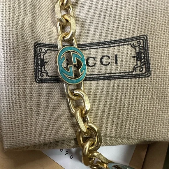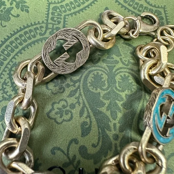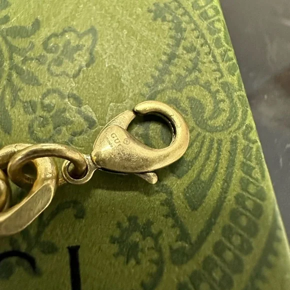 Super cute and light weight bracelet. Bracelet is 8inches but is adjustable. GGs are a teal/green enamel. Bracelet is gold tone. Stamped. Comes with care card, dust bag and box.