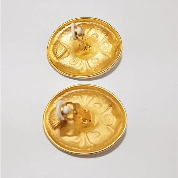 Beautiful Karl Lagerfeld clip earrings round gold-tone with green enamel and faux pearl.Measures 1.75” x 1 7/16”, excellent vintage condition – please see photos and message...