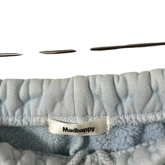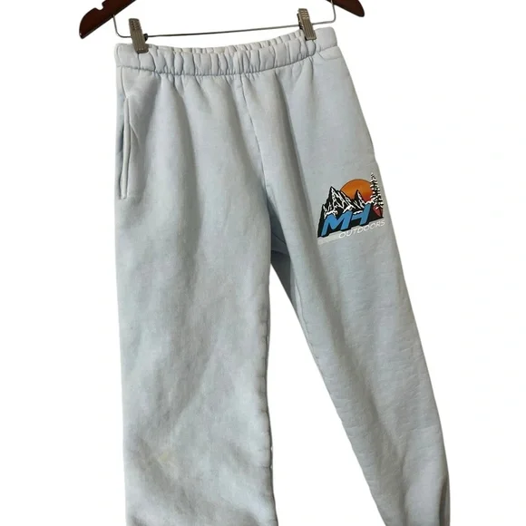 MADHAPPY Graphic mountain joggers100% cottonWith pocketsIn good pre loved condition. Stain towards the bottom left leg, see pics. No other flawsSz Medium Waist across 13”Rise...