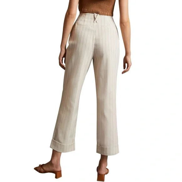 Elevate your style with these chic cream striped pants from Anthropologie. Perfect for any occasion, these pants offer a sophisticated look with a comfortable fit.FeaturesHook-eye and zipper closurePleated frontUnlinedCroppedHigh riseSide pockets Size: US 4Color: CreamMaterials: 55% Polyester/45% CottonWaist: 13.5 inRise: 13.25 inInseam: 27 inMeasurements are proximate laying down flat
