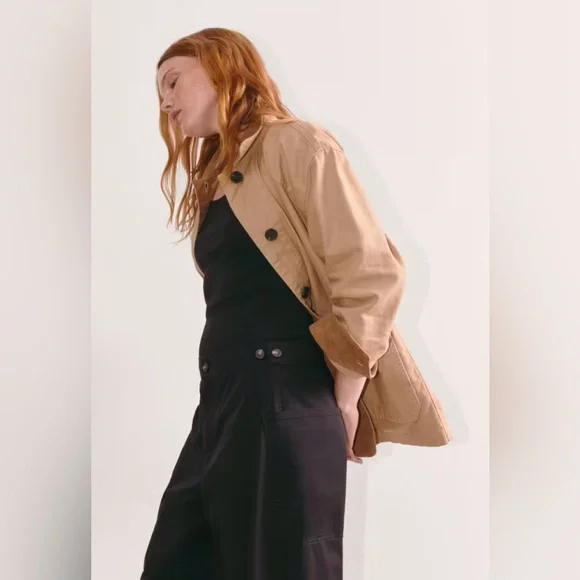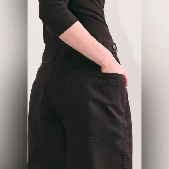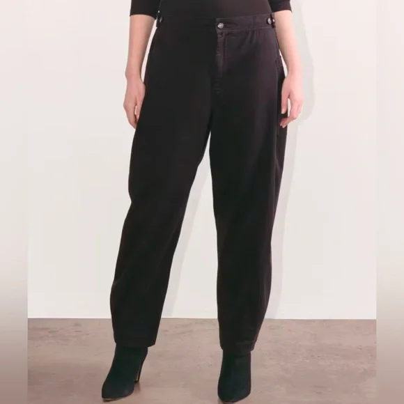 About This Style.This piece features a high rise, barrel leg, regular length, zipper closure, waistband buttons on the side seams for adjustability, in organic cotton.High-riseInseam: 27"Lightweight cottonMaterials98% Organic Cotton, 2% ElastaneCareMachine wash cold with like colors. Only non-chlorine bleach when needed. Tumble dry low. Warm iron when needed.Sustainability DetailsDid You Know? Organic cotton uses crop rotation, cover crops, and organic fertilizers instead of toxic chemical fertilizers or pesticides—which means cleaner water, lower water usage, lower pesticide use, healthier soil, and a safer working environment for cotton farmers, compared to conventional cotton.