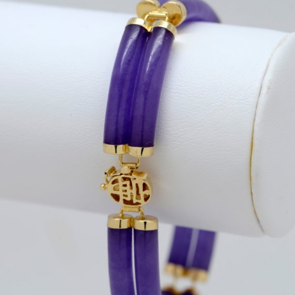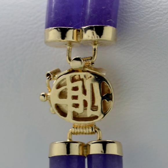 Twelve curved solid tubes of polished Lavender Jade are linked together with Yellow 14 Karat Gold. An oriental "Joy Symbol" box tab insert clasp with a safety catch .Jade is a symbol of serenity, purity good luck and protection for the wearer7" Hallmarked Stamped 14KPlease no low offers I believe this is priced more than fairly.Thank you.