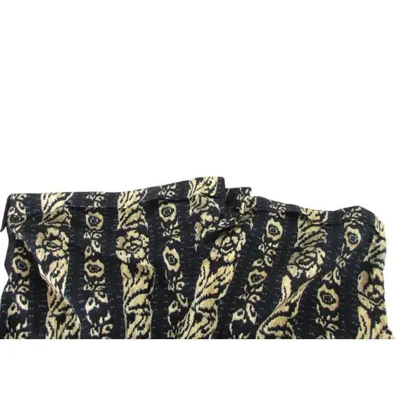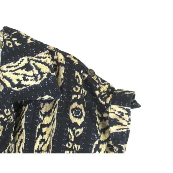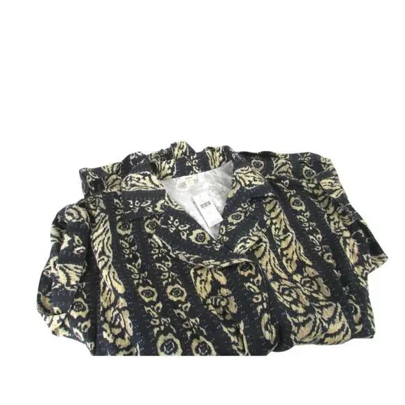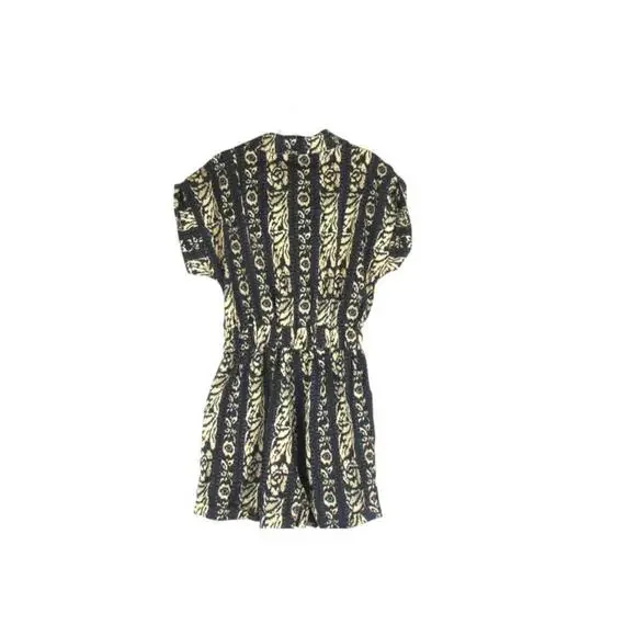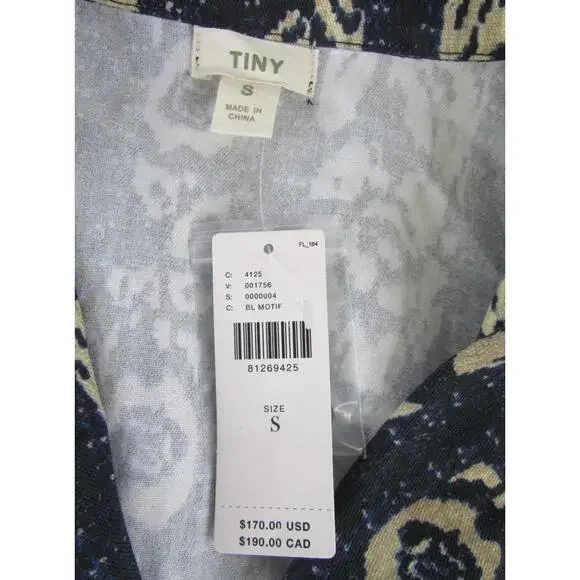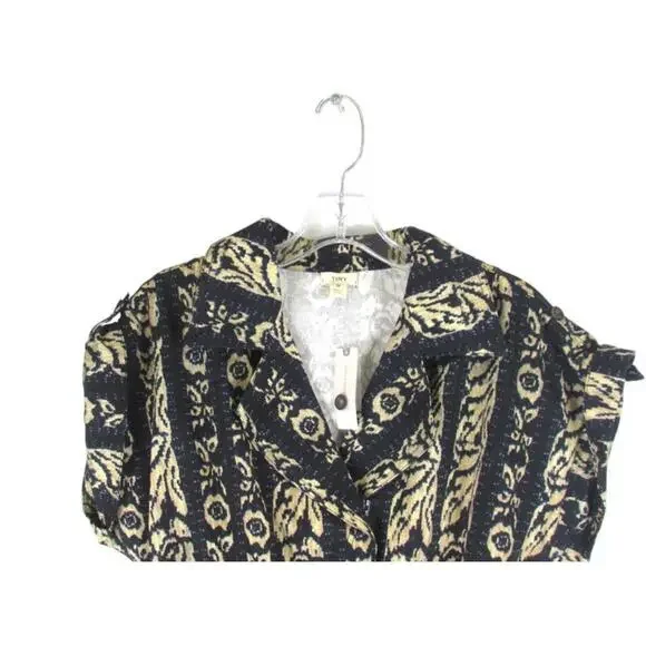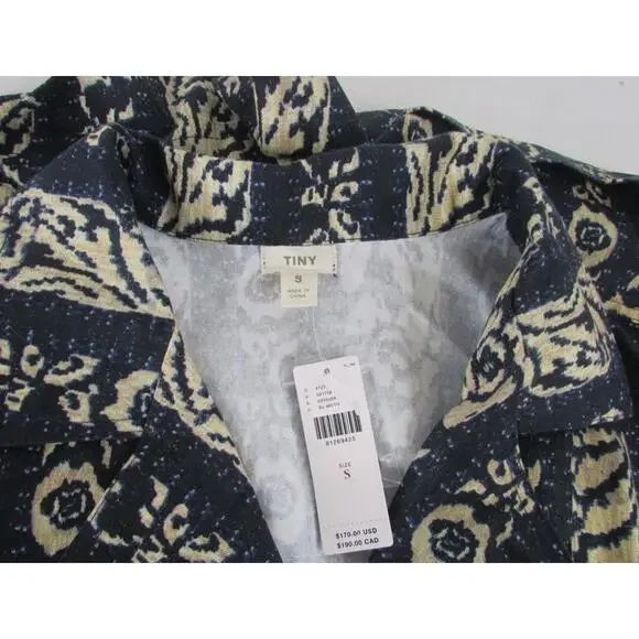 The Tiny Anthropologie Ella Romper in size Small features a tribal print in navy and beige, making it perfect for casual occasions during the summer and spring seasons. This one-piece romper includes a zip closure, cap sleeves, and is made of linen material. With a stylish design and easy care instructions (machine washable), this romper is a trendy addition to any woman´s wardrobe, offering a comfortable and fashionable option for a variety of outfits.