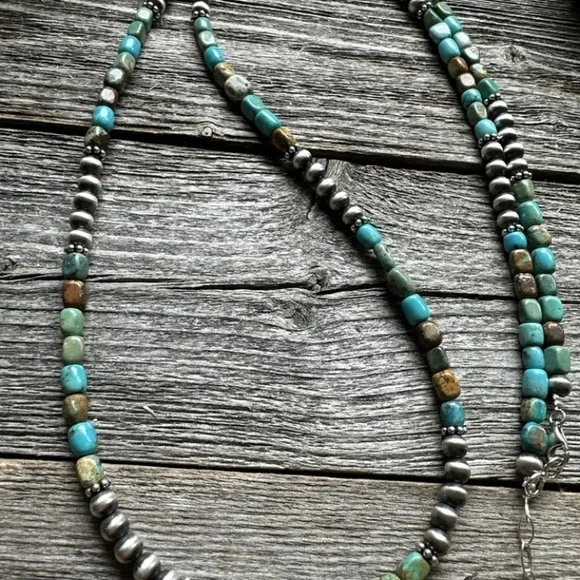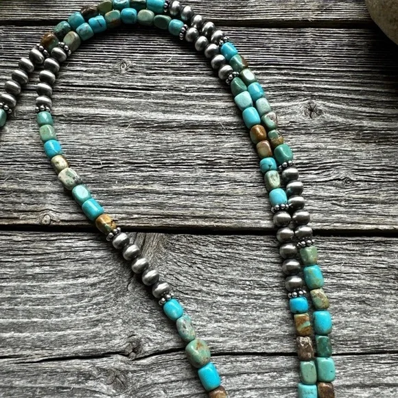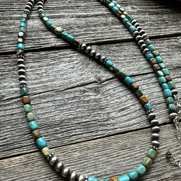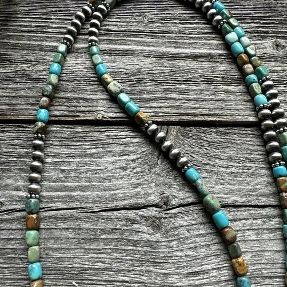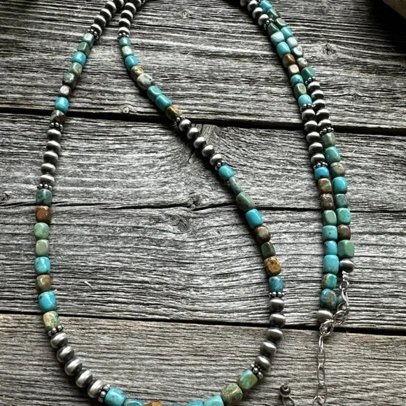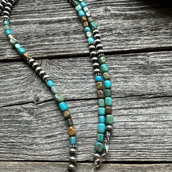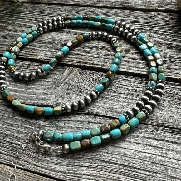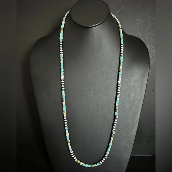 Sterling Silver Blue Green Turquoise W Pearls Bead Necklace. 36 inch