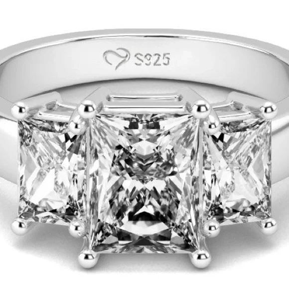 Radiant Sterling Silver. Elegant yet at an affordable price. These are man made diamonds the look and feel as though they were unearthed in a diamond plantation. Make this ring...
