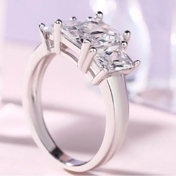 Radiant Sterling Silver. Elegant yet at an affordable price. These are man made diamonds the look and feel as though they were unearthed in a diamond plantation. Make this ring your own this Valentines or acquire for that special someone.