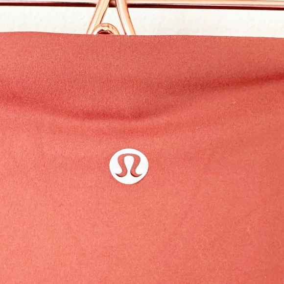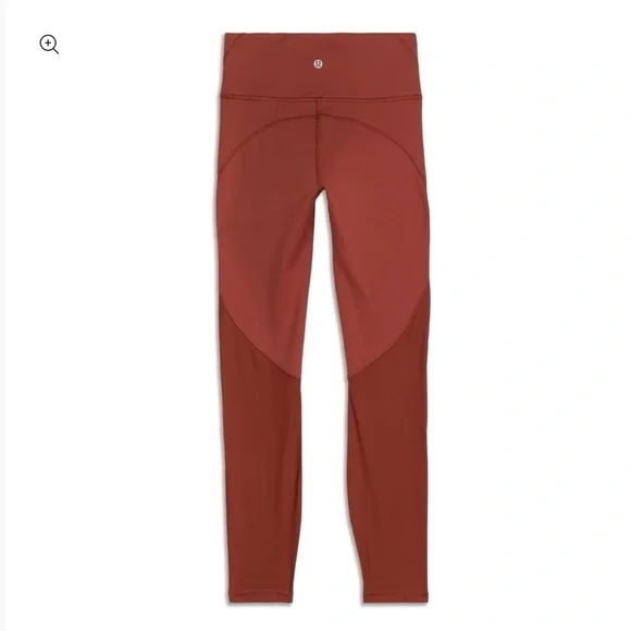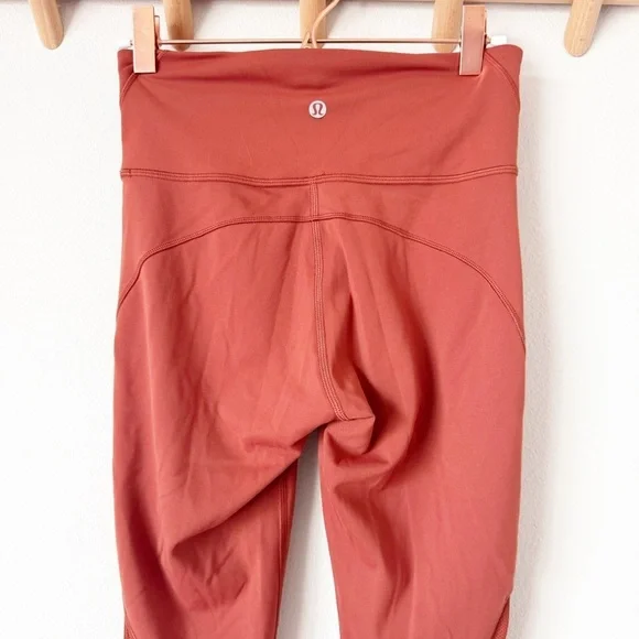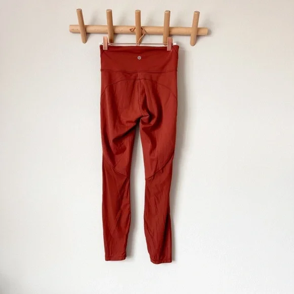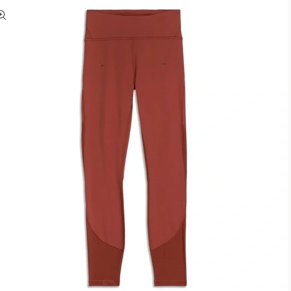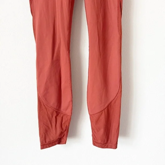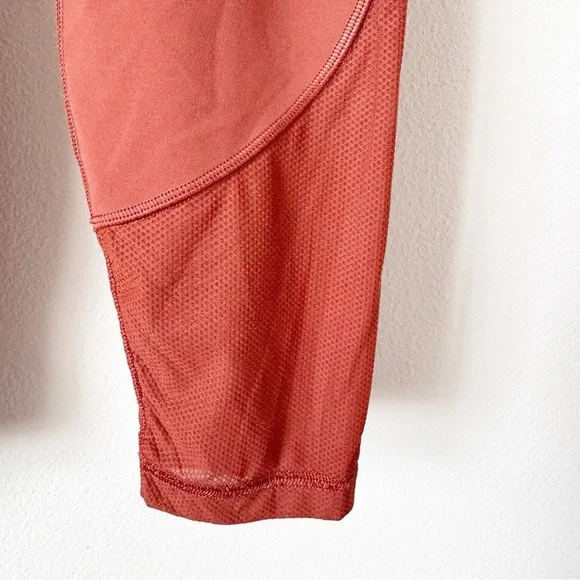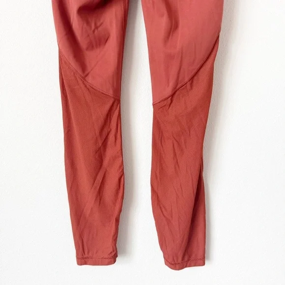 Dark terracotta high rise leggings with mesh. In good condition with logo slightly lifting as shown. No other flaws or signs of wear. Waist | 12” across Rise | 10”Inseam | 25”