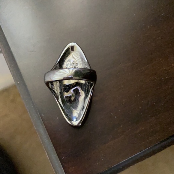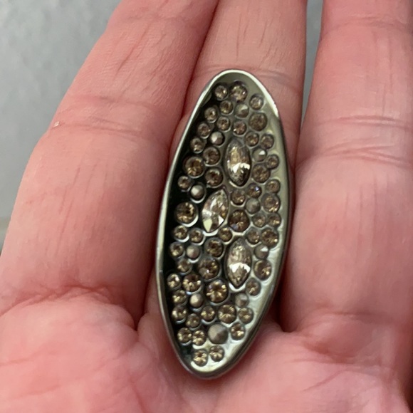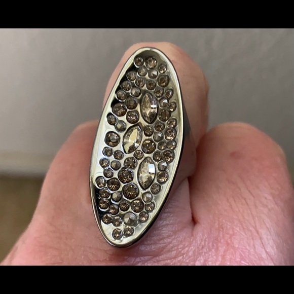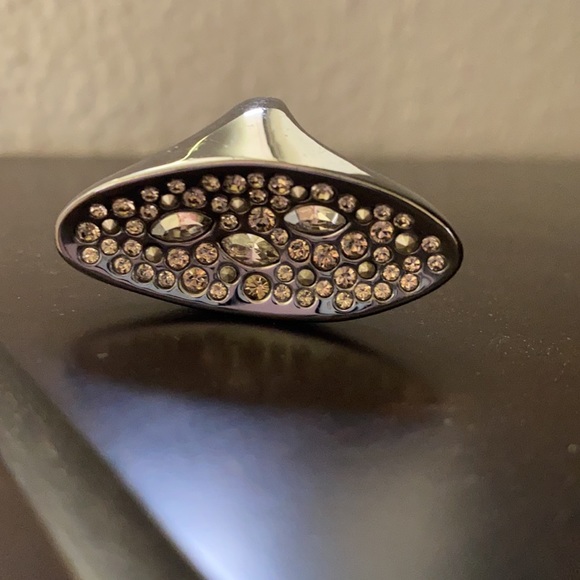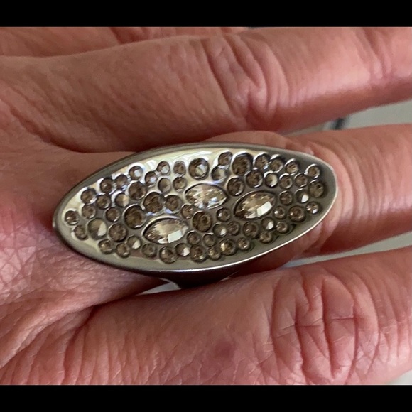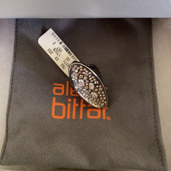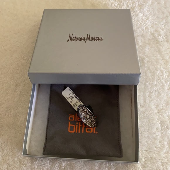 Pebbles of hand-set Swarovski crystals are submerged in an indent of lustrous metal fashioning an edgy statement ring.Hand-set crystals illuminate the shallow contour of a beautiful ring crafted in lustrous metal.Approx. setting dimensions: 5/8"W x 1 1/2"L.Swarovski crystals/base metal/ruthenium plating.By Alexis BittarNew with tagsSize 7Length of ring is approximately 1 1/2 inchesPurchased at Neiman MarcusIncludes branded bag and boxAbsolutely authentic