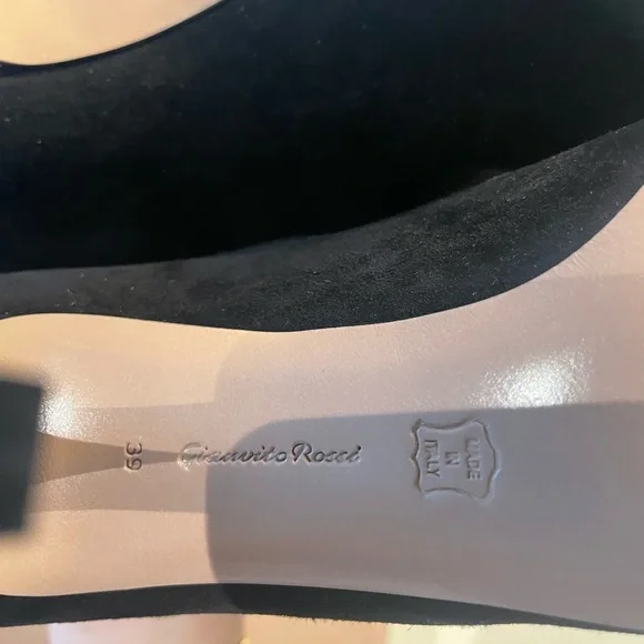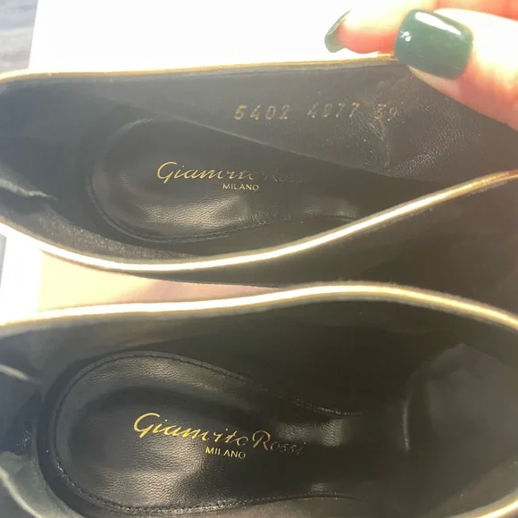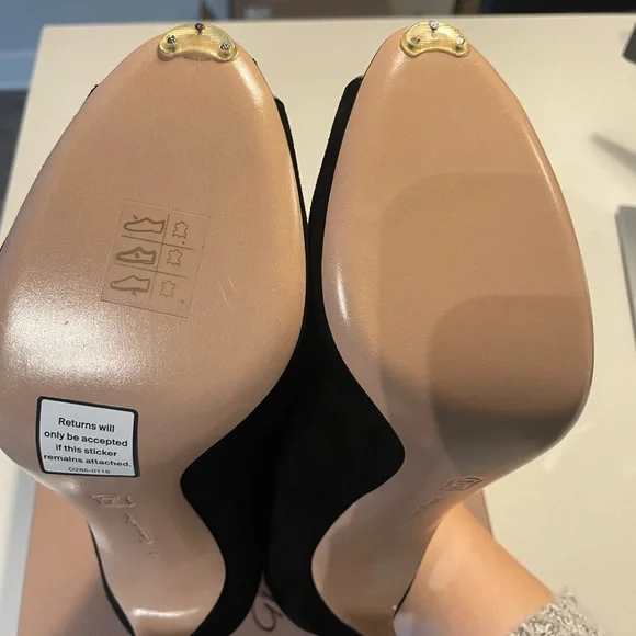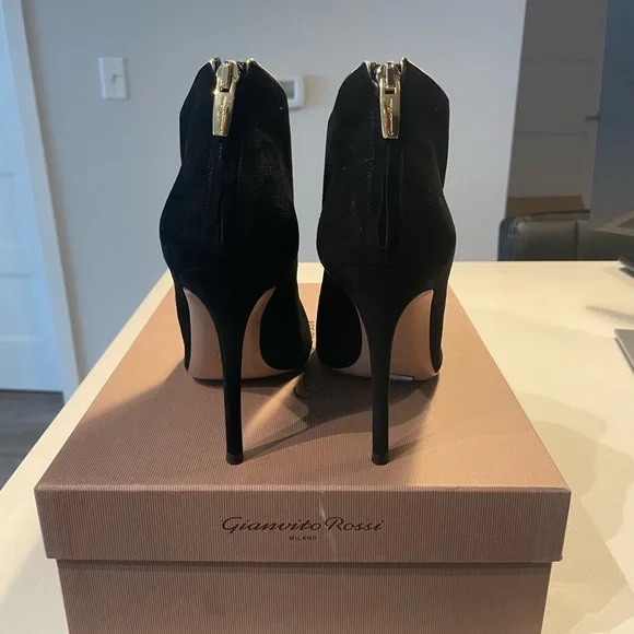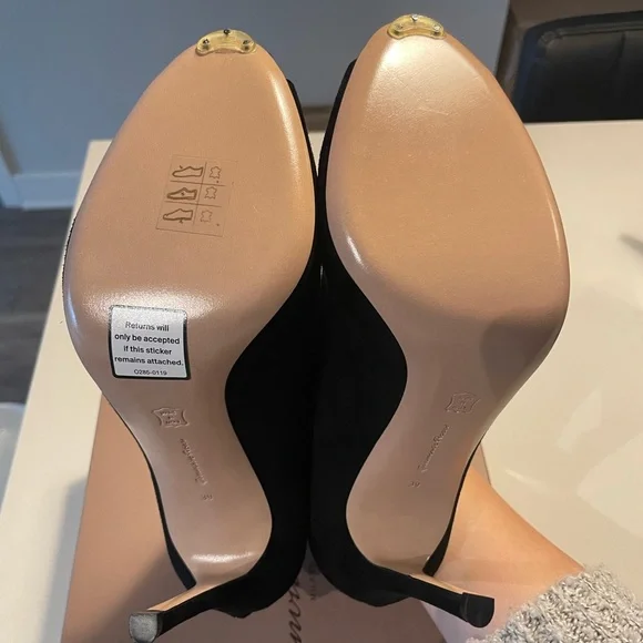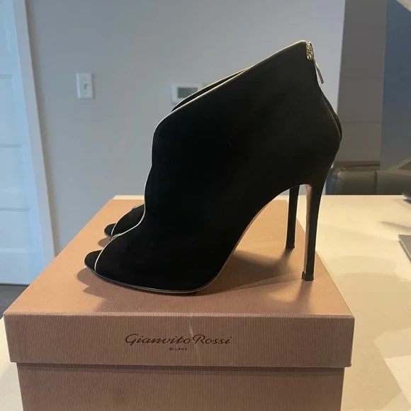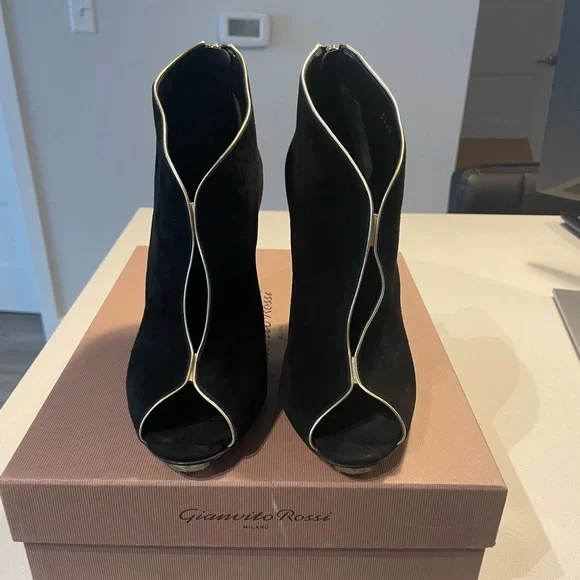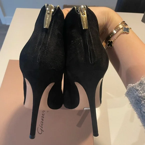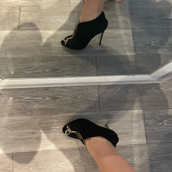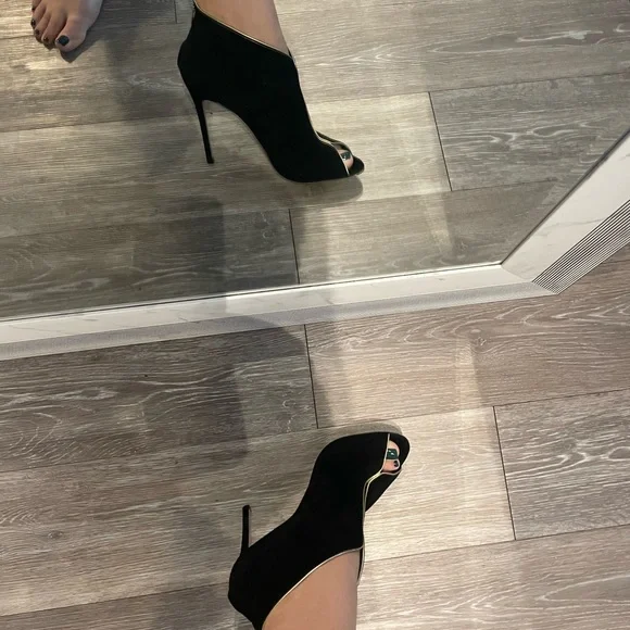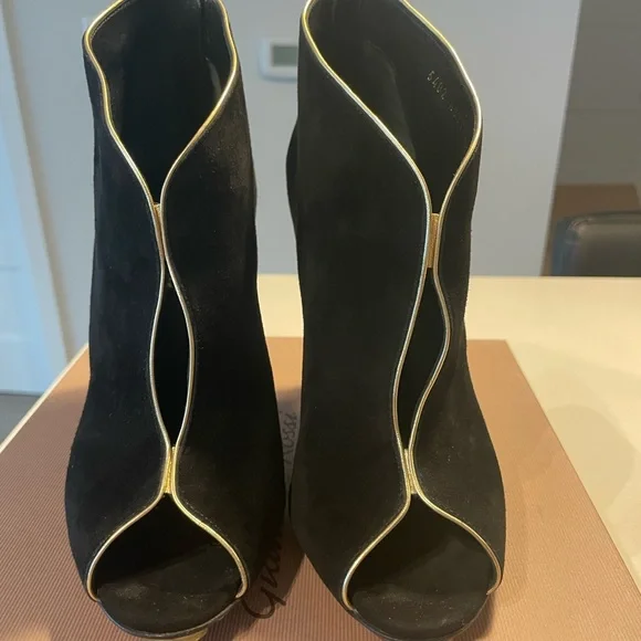 -Back Suede Pumps with gold leather trim-Peep toe with cut out accents-stiletto heels-exposed zip closure on backSize 39. Like new condition!