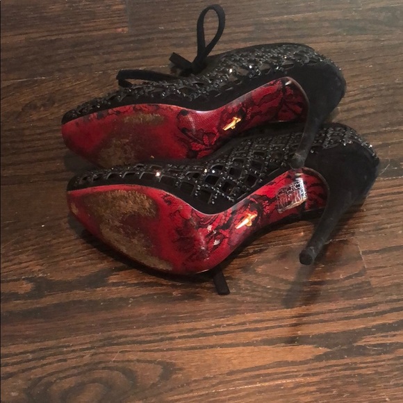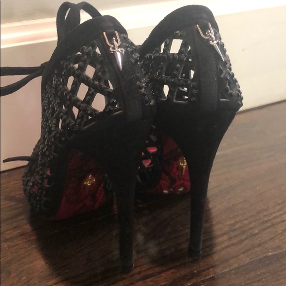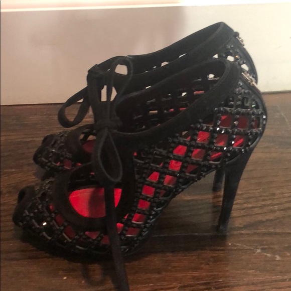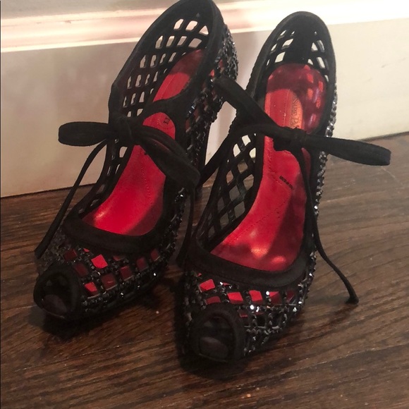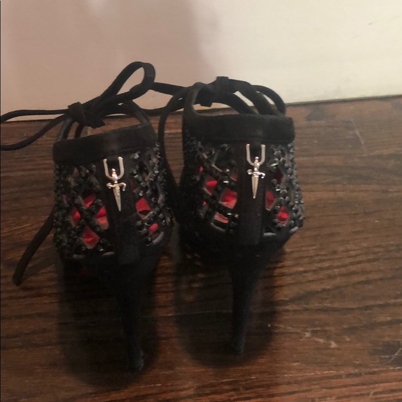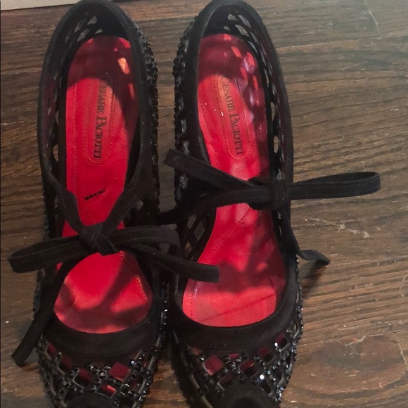 Black Sawatzke crystal and suede Cesare Paciotti shoes. Excellent condition beautiful moving dagger charm on the back of the shoe. Size 6 1/2. Very comfortable. 4 1/2 inch heel.