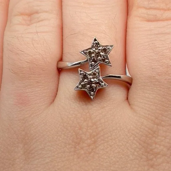 The warmth of the cognac diamonds in this ring are beautiful. They´re close to an amber shade a little bit lighter in color than a chocolate diamond. Stamped as .925 which means this ringis made completely of sterling silver making it a beautiful and affordable diamond ring. The band of the ring is thick and sturdy and perfect for regular every day wear. While diamonds sit very securely in tight prong settings inside the matching twin stars that are the highlight of this ring. The diamonds are wonderfully sparkly under any light but looks even better under natural sun light!This ring is currently sized as a US size 8